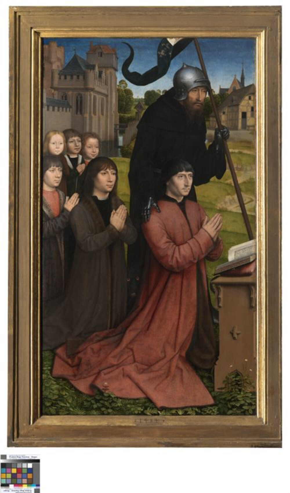 Op de schilderijen van de Vlaamse primitieven, zoals dit triptiek van Hans Memling, zie je vaak de opdrachtgevers met hun bescherm- of naamheilige staan. Het katholicisme kent duizenden heiligen, dus hoe identificeer je welke heilige wordt afgebeeld? De meeste heiligen zijn herkenbaar aan de attributen waarmee ze worden afgebeeld. Dat zijn vaak voorwerpen die uit hun legende komen, zoals bij de heilige Barbara van Nicomedië (op het rechterluik), die volgens het verhaal door haar vader in een toren werd opgesloten. Anderen worden afgebeeld met de attributen van hun marteldood, zoals de heilige Catharina van Alexandrië met het wiel en zwaard (zie het Johannesretabel, eveneens van Hans Memling). En sommigen zijn te identificeren op basis van hun uiterlijk of hun omgeving. De identificatie van het onderwerp of diepere betekenis van een voorstelling aan de hand van figuren en hun voorwerpen wordt ‘iconografie’ genoemd en is een belangrijk hulpmiddel voor kunsthistorici.