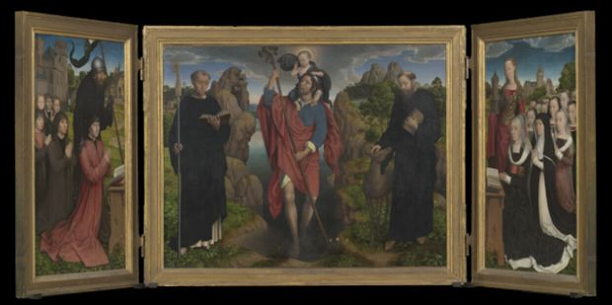 15de eeuwDe triptiek is aan drie heiligen gewijd, die op het middenpaneel zijn afgebeeld. Centraal staat Christoffel die met het Kind Jezus op de schouders de rivier oversteekt. De bloeiende staf in zijn hand en de heremiet die vanuit een spelonk de oever bijlicht, behoren tot de vaste attributen van de heilige. Aan weerszijden van de oever staan twee andere heiligen: links een monnik met kromstaf en open boek - de heilige Maurus -, rechts de heilige Gillis met de hinde en een pijl in de arm. Op de zijluiken, waarover hetzelfde landschap zich verder uitstrekt, knielen de opdrachtgevers. De man wordt beschermd door de heilige Willem van Maleval, de vrouw door de heilige Barbara. Het betreft Willem Moreel, een belangrijk Brugs politicus, en zijn vrouw Barbara van Vlaenderbergh, alias Van Hertsvelde, die samen met hun kinderen afgebeeld zijn. De heiligen Maurus en Gillis werden gekozen in functie van de familienamen Moreel en Hertsvelde. Maurus en Moreel hebben dezelfde etymologie, terwijl het hert van de heilige Gillis verwijst naar de naam Hertsvelde. Voor- en familienaam van de schenkers zijn hier dus symbolisch voorgesteld door de koppeling van de patroonheilige op het zijluik aan de heilige op het middenluik. Maurus en Gillis waren tevens de beschermheiligen van de familiekapel in de Sint-Jacobskerk, waar het echtpaar begraven werd. Gesloten tonen de luiken Johannes de Doper en de heilige Joris in grisaille. De Moreeltriptiek is een van de voorlopers van het Vlaamse groepsportret.
