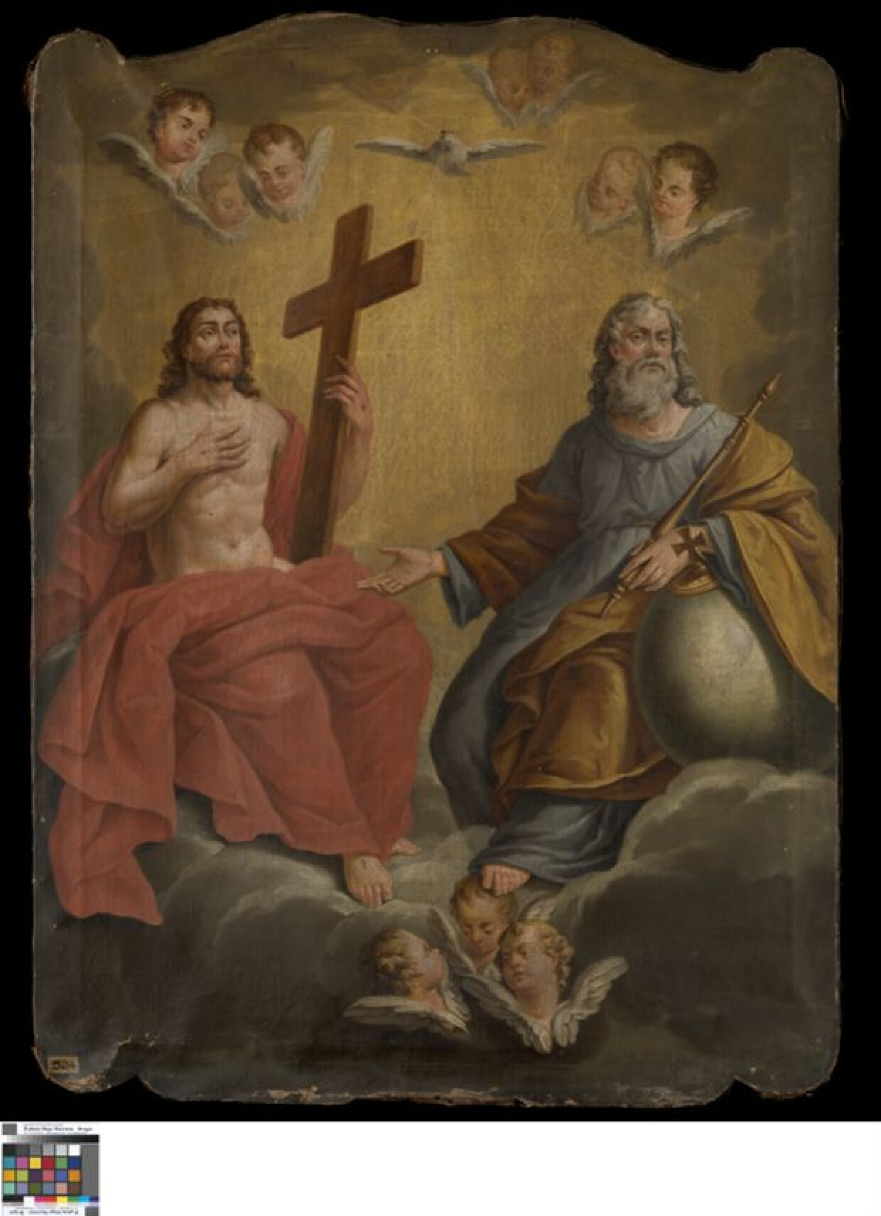 God de Vader zit rechts, kijkt naar de toeschouwer en wijst met een breed gebaar zijn Zoon Christus, links van hem, aan. In zijn rechterhand houdt hij een staf vast, onder zijn arm ligt een globe. Christus blikt naar omhoog, met zijn rechterhand tegen zijn borst; in zijn linkerhand een groot houten kruis. Boven bevindt zich de Heilige Geest, in de gedaante van een vliegende duif. Zowel bovenaan als onderaan ziet men een aantal gevleugelde engelenhoofdjes. De geornamenteerde vorm van het doek doet vermoeden dat het ooit ingewerk was in een rococolambrisering.