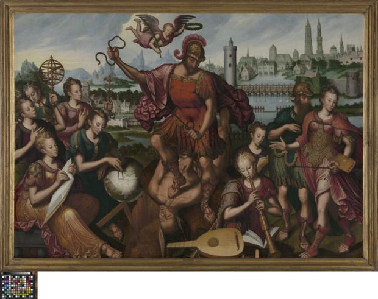 17de eeuwMars overmeestert de Onwetendheid, een naakte figuur met ezelsoren. De gevleugelde Victoria komt met lauwerkrans en palmtak voor de overwinnaar aangevlogen. De Romeinse oorlogsgod wordt geflankeerd door de Wetenschappen en de Kunsten, elk gepersonifieerd door rijk getooide vrouwen. Links staat de Astronomie met armillarium, de Dialectica met papegaai, de Grammatica met sleutel en al schrijvende, de Retorica met sleutel en caduceus en de Geometrie met wereldbol, passer en winkelhaak. Rechts staat de Muziek, spelend op een balsschalmei en met luit, trompet en hoorn aan haar voeten, de Aritmetica schrijft op een wastablet en de Schilderkunst heeft een palet en penselen in de hand. Mars wordt nog een tweede keer uitgebeeld, als de Romeinse soldaat die de Schilderkunst in bescherming neemt. Traditioneel vertrappelt Mars de Kunsten, beschermd door Minerva, en worden zo de verschrikkingen van de oorlog gesymboliseerd. De ontvoogdingsstrijd van de kunstschilders tegenover de ambachtslui en de officiële erkenning van de schilderkunst als één van de Artes liberales, zijn Claeissens’ uitgangspunt voor de uitvinding van deze nieuwe allegorie.