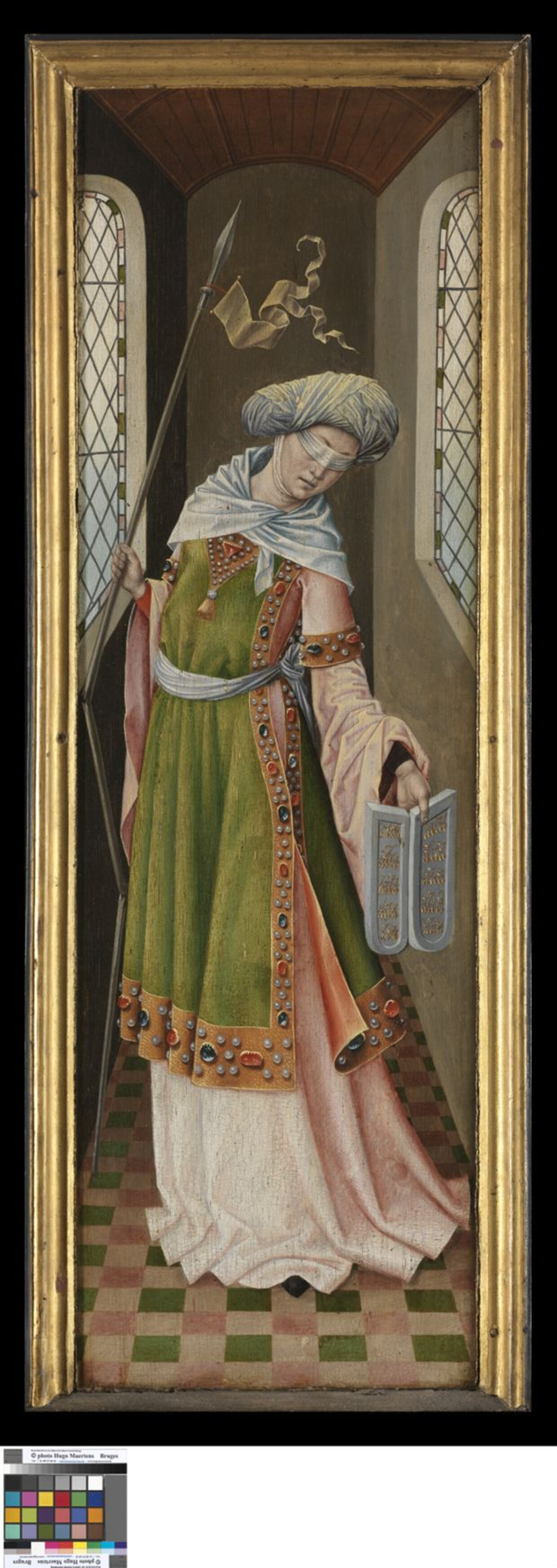 15de eeuwDit is een van de twee kleine luikjes (samen met 0000.GRO1544.I), die wellicht tot hetzelfde retabel van de legende van de heilige Ursula (0000.GRO1542.I-1543.I) behoorden. Het stelt de Synagoge of het Oude Testament voor. De Synagoge is geblinddoekt en houdt in de rechterhand een gebroken lans en in de linker de oude tafelen der wet die haar ontglippen. Op de achterzijde is in grisaille de Maria van de Boodschap voorgesteld.