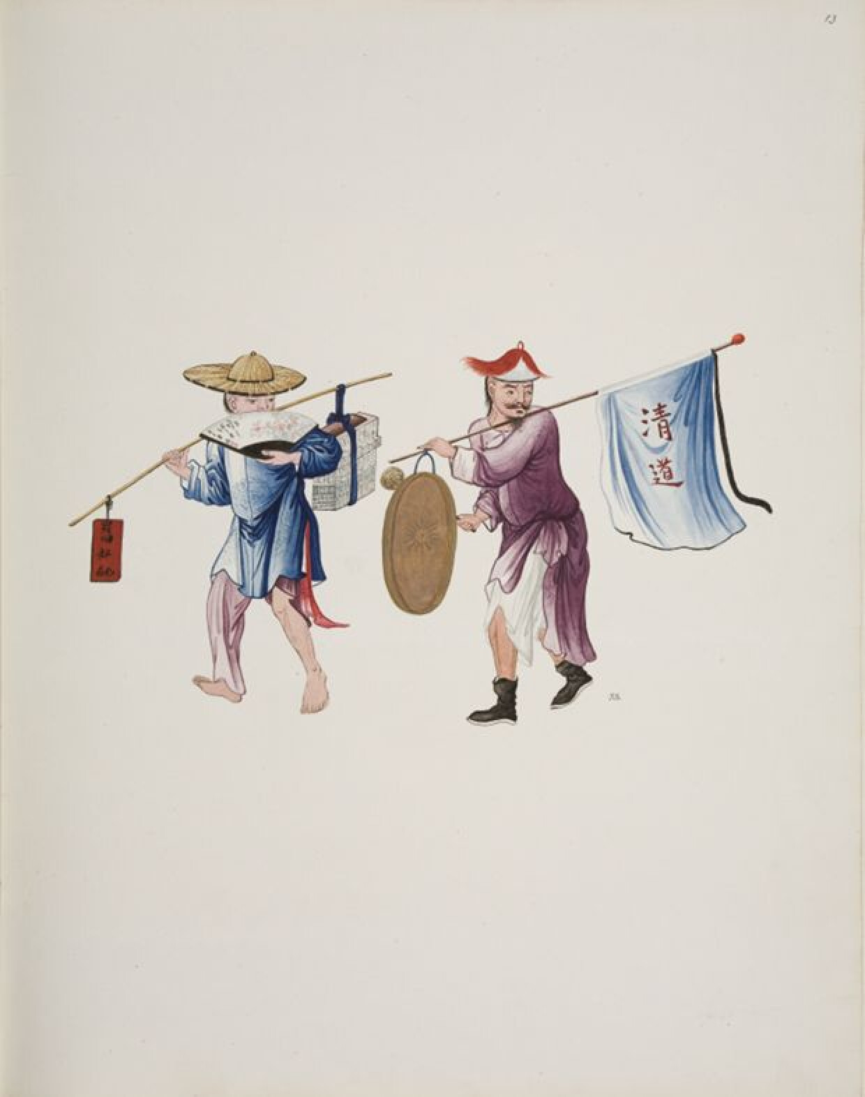 18de eeuwDeze tekening maakt deel uit van het Oosters Album (0000.GRO3119.II). De voorstelling toont twee figuren in traditionele Aziatische kleding afgebeeld op een neutrale achtergrond. Bij beide personages is een stukje van hun afgeschoren hoofdhuid en lange staart in de hals zichtbaar; ze stammen dus uit de Ch'ing dynastie. De linkerfiguur draagt een strooien hoed om zich tegen de zon te beschermen en loopt blootsvoets. De rechterfiguur is wel geschoeid en heeft een zomerhoed op het hoofd.