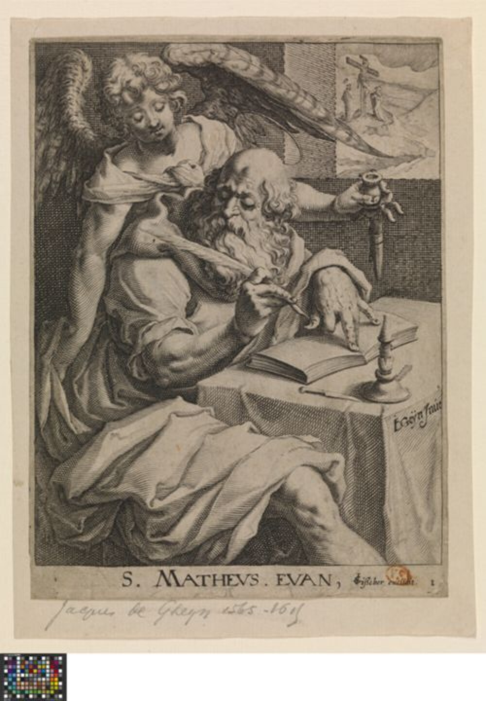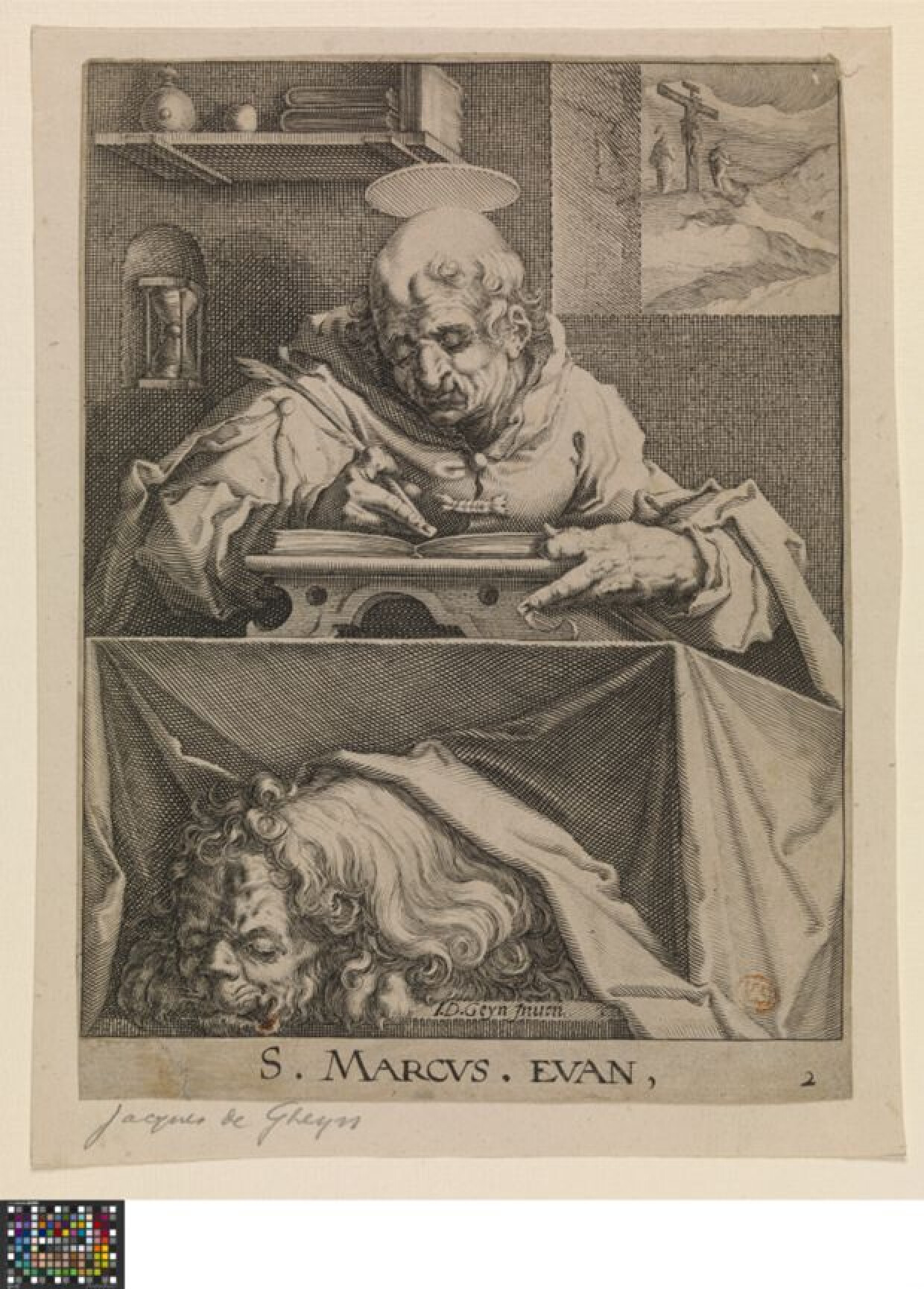 (1654)De heilige Marcus is van voren afgebeeld terwijl hij, leunend op een tafel, zijn evangelie schrijft. Onder het tafelkleed ligt de leeuw. Door het raam rechts op de achtergrond zijn de gekruisigde Christus met Johannes en Maria te zien. In de marge onderaan is de naam van de evangelist gegraveerd. De prent is gemaakt naar ontwerp van Jacques de Gheyn II en uitgegeven door Claes Jansz. Visscher (New Holl. The De Gheyn Family, 68-71, 69).