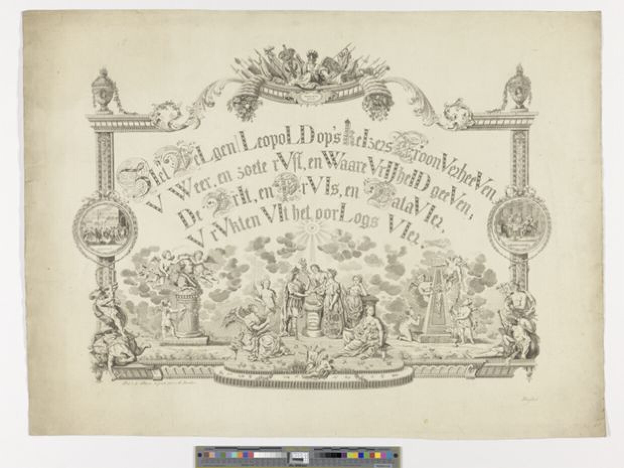 18de eeuwHuldegedicht, meer bepaald een tijdvers of chronogram, aan Leopold II (1747-1792), vanaf 1790 keizer van het Heilig Roomse Rijk der Duitse Natie en tevens vorst van de Zuidelijke Nederlanden. Centraal in een boog het lofdicht in vier regels. De optelsom van de capitalen of romeinse cijfers is 1790, het jaar van de kroning. Links onder het gedicht een buste van Leopold II op een halve zuil. Twee vliegende engelen houden hem een laurierkrans boven het hoofd, een derde engel versiert de zuil met bloemenslingers. Centraal onder het gedicht eveneens Leopold II. Deze keer met keizerskroon op het hoofd en gekleed in een romeins militair uniform. Een naakte vrouwenfiguur met laurierkrans overhandigt hem een olijftak omwikkeld met een banderol met daarop "Pax et Libertas". Hij houdt de hand vast van een andere vrouwenfiguur, eveneens met laurierkrans op het hoofd, met één ontblote borst. Zij stelt de Zuidelijke Nederlanden voor, ze houdt namelijk een wapenschild vast met een parellijst en een strik. Het wapenschild is in twee doorsneden, waardoor drie rijen. Eerste rij: Vlaanderen, Henegouwen, Brabant. Tweede rij: Antwerpen, Mechelen, Namen. Derde rij: Limburg, Luxemburg, Gelderland. Tussen de keizer en de schilddraagster een sokkel met opschrift "Aurea condet saecula" wat zoveel betekent als "gouden tijd". Op de sokkel ligt een bijbel. Het drietal wordt omringd door allegorische figuren. Links een naakte vrouwenfiguur met een zon boven het hoofd en een palmtak en een schrijvende engel. Rechts een vrouw met een ring en zwaard die op een zuil leunt en een vrouw zittend op een bankje met naast zich een hond. Rechts onder het gedicht een conische zuil of monument met een gekruisigde Christus met daarrond verschillende engelen. Het geheel wordt omkadert door een rijk geïllustreerde lijst. Centraal bovenaan het Habsburgse wapen met de tweekoppige adelaar, vastgehouden door Minerva omgeven door vaandels, banieren, speren (waaronder een speer met hoed, teken van standvastigheid), en hoorns des overvloed. Aan de zijkanten twee medaillons met laurierkransen die respectievelijk de strijd van de Brabantse Omwenteling en de daaropvolgende vredesonderhandelingen afbeelden. Tenslotte onderaan Hermes of Mercurius en twee zeegoden (rechts) en Hercules met knuppel (links). De ets werd gemaakt door Antoni Zürcher. De prent werd op gevergeerd papier gedrukt met centraal het watermerk van de Hollandse papierfabrikant D. & C. Blauw (versie met het schild en initialen, zie: Churchill, William Algernon. Watermarks in paper in Holland, England, France, etc. in the XVII and XVIII centuries and their interconnection. Amsterdam: Menno Hertzberger & Co., 1935. pp 74, 171).