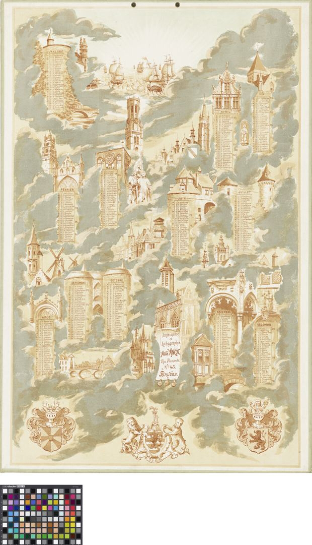 19de eeuwKalender voor het jaar 1897 met elke maand afzonderlijk opgelijst. In de eerste kolom de eerste letter van de weekdag, de 'D' van 'Dimanche' steeds in vetjes. In de tweede kolom de dag van de maand. In de derde kolom tenslotte de heilige die op die dag wordt gevierd. Naast de kolom staat de maancyclus aangeduid met 'NL' (nouvelle lune), 'PC' (premier croissant), 'PQ' (premier quartier) en 'PL' (pleine lune). Deze maandtabellen zijn in een wolkenmassa opgenomen en worden afgewisseld met Brugse bezienswaardigheden. Met wijzerzin, te beginnen van boven: een zeezicht met zeilschepen verlicht door de stralen van de ondergaande op opgaande zon. De toren van de Sint-Gilliskerk. Het Brugs Beertje in de nis van de Poortrersloge. De geveltop van de Griffie van het Brugse Vrije. De Onze-Lieve-Vrouwekerk en de spitse torentjes van het Brugse Vrije met het wapenschild van het Brugse Vrije. De Ezelpoort. De torentjes van het Boterhuis. De toren van de Jeruzalemkerk. De top van de Sint-Joristoren. Toren van het Oosterlingenhuis. Het tolhuis. Het paradijsportaal van de Onze-Lieve-Vrouwekerk. De toren van de Poortersloge (?). De erker van het huis van Herman van Outvelde aan de Vlamingbrug. Het stadhuis. De brug naar het begijnhof. De kruispoort. Het torentje van de Sint-Sebastiaansgilde met de op de achtergrond twee molens aan de vesten. De achterkant van de huizen aan het huidenvettersplein gezien vanaf de Dijver. Het standbeeld van Jan Breydel en Pieter de Coninck. Huis Boechoute. Het belfort of de halletoren. De Sint-Salvatorskathedraal. De Poertoren en de boogbrug over het minnewater. De toren van de Kapel van het Heilig Bloed. Onderaan zijn de wapens afgebeeld van de provincie West-Vlaanderen, de stad Brugge en Vlaanderen. De kalender werd gedrukt en uitgegeven door de Brugse firma Ancot. Bovenaan zijn twee gaatjes aangebracht voorzien van een metalen ringetjes. Door de gaatjes een rood lint om de kalender op te hangen.