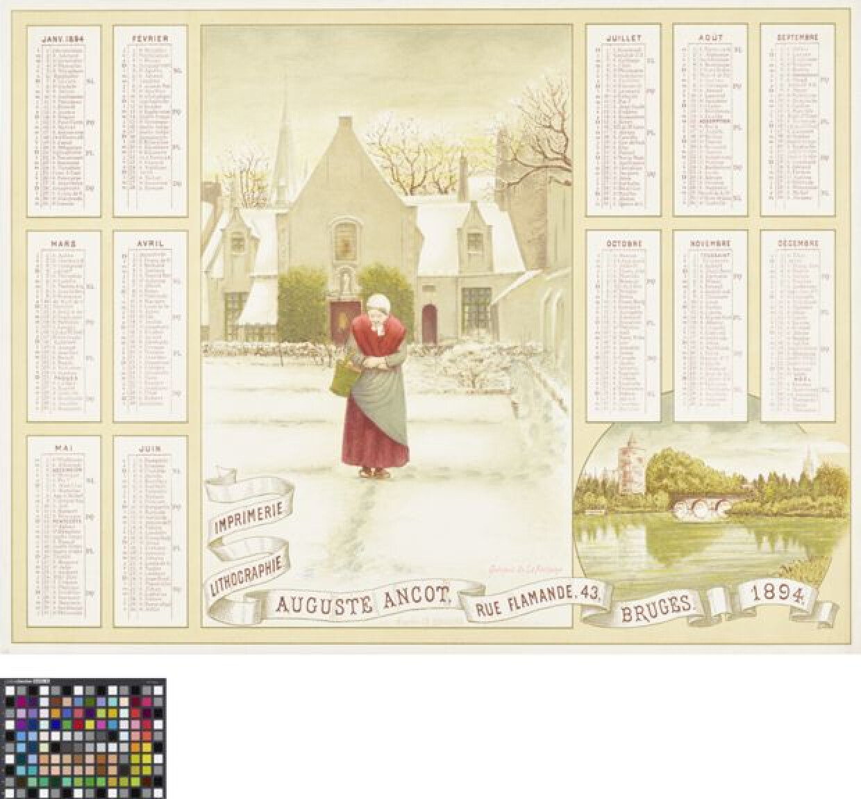19de eeuwKalender voor het jaar 1894. Elke maand is afzonderlijk opgelijst. In de eerste kolom de eerste letter van de weekdag, de 'D' van 'Dimanche' steeds in vetjes. In de tweede kolom de dag van de maand. In de derde kolom tenslotte de heilige die op die dag wordt gevierd. Naast de kolom staat de maancyclus aangeduid met 'NL' (nouvelle lune), 'PC' (premier croissant), 'PQ' (premier quartier) en 'PL' (pleine lune). Daarnaast een gezicht op de besneeuwde binnenplaats van het Brugse Godshuis 'De La Fontaine', ook wel 'De Fontaine' genoemd. Op de voorgrond een dame in lange rok met witte muts en halsdoek, een mand aan de arm. Frontaal zicht op de gevel van de barokkapel, geflankeerd door twee huizen. In de verte de torenspits van de parochiekerk van de Heilige Maria Magdalena en de Heilige Catharina, ook kortweg Magdalenakerk genoemd. Deze lithografie werd gemaakt naar een voorbeeld van de Brugse schilder Charles Rousseau (1862-1916). Rechtsonder een gezicht op de boogbrug en Poertoren aan het Minnewater. De kalender werd gerdukt en uitgegeven door de Brugse firma Ancot.