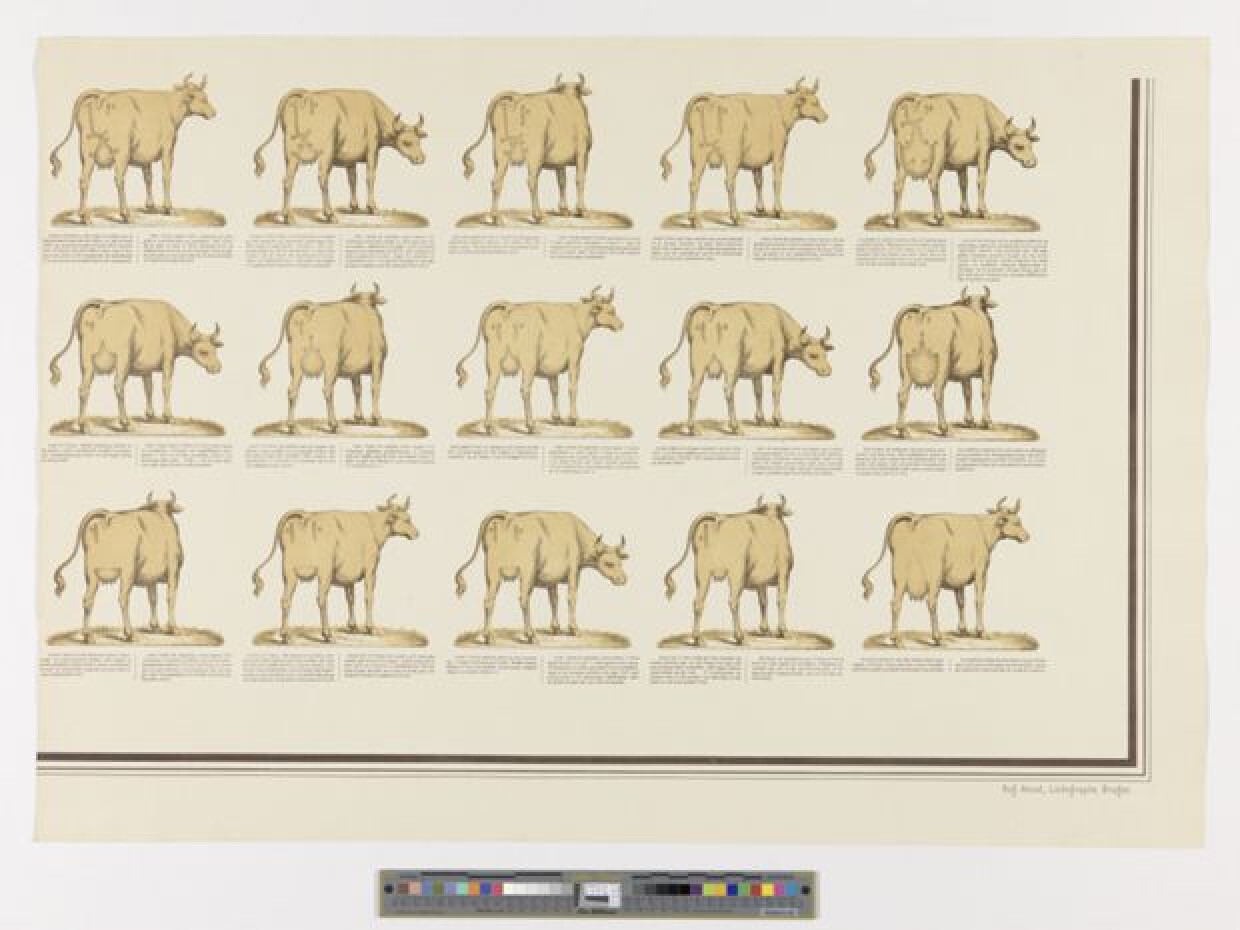 19de eeuwLithografie uit een reeks van 6 dezelfde affiches bestaande uit 6 prenten over de eigenschappen van goede en slechte melkkoeien met letteraanduidingen op de prent die de verschillende kenmerken aangeven. Onder elke afbeelding op de prenten staat de uitleg in het Nederlands en het Frans. Deze prent is gedrukt op een gele achtergrond. Deze prent is het rechter benedendeel van de affiche.