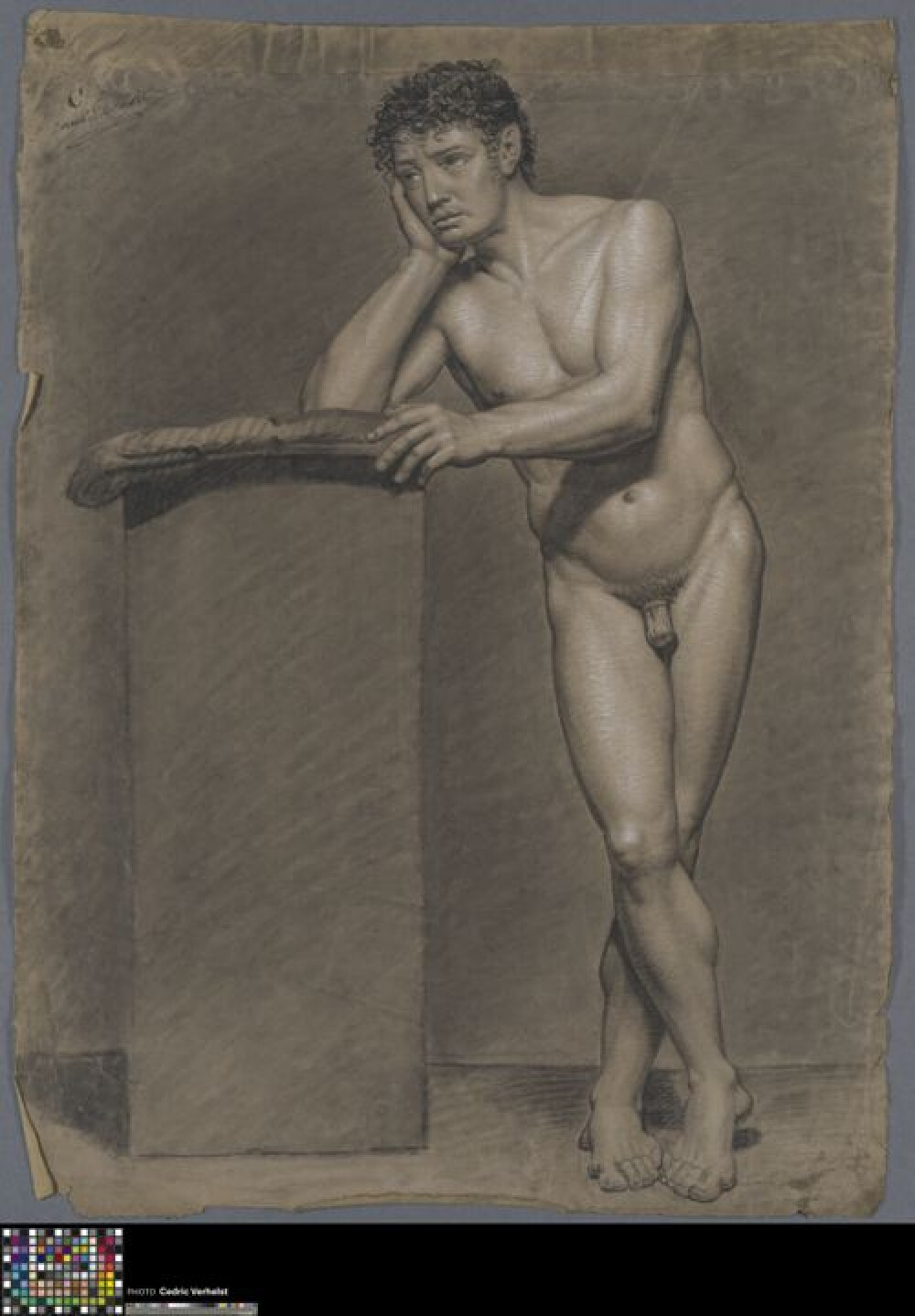 Academische studie van een staand mannelijk naakt, naar levend model getekend door een leerling van de Brugse academie tijdens een wedstrijd. De naam van de tekenaar en de datum zijn niet vermeld. Het is ook niet gekend welke plaats of prijs de leerling behaalde. Het model poseert frontaal voor de tekenaar. De man staat met gekruiste benen naast een sokkel. Hierop leunt hij met zijn elleboog en ondersteunt daarbij zijn hoofd. Hij houdt zijn andere hand tegen het kussen dat op de sokkel ligt. Het gebruikte medium is zwart krijt of houtskool, gehoogd met wit krijt. Linksboven staat de tekenletter van de leerling voor anonieme jurering. Franciscus van der Donckt plaatste hier zijn handtekening. Hij was directeur van de academie van 1802 en 1812. Deze wedstrijdstudie kan dan ook in deze periode gedateerd worden. Er zijn nog twee studies bewaard die getekend zijn door andere anonieme leerlingen tijdens dezelfde wedstrijd: 0022.GRO0537.II. en 0022.GRO0359.II