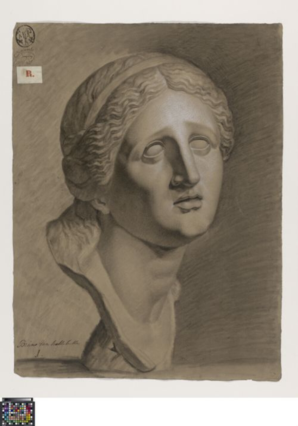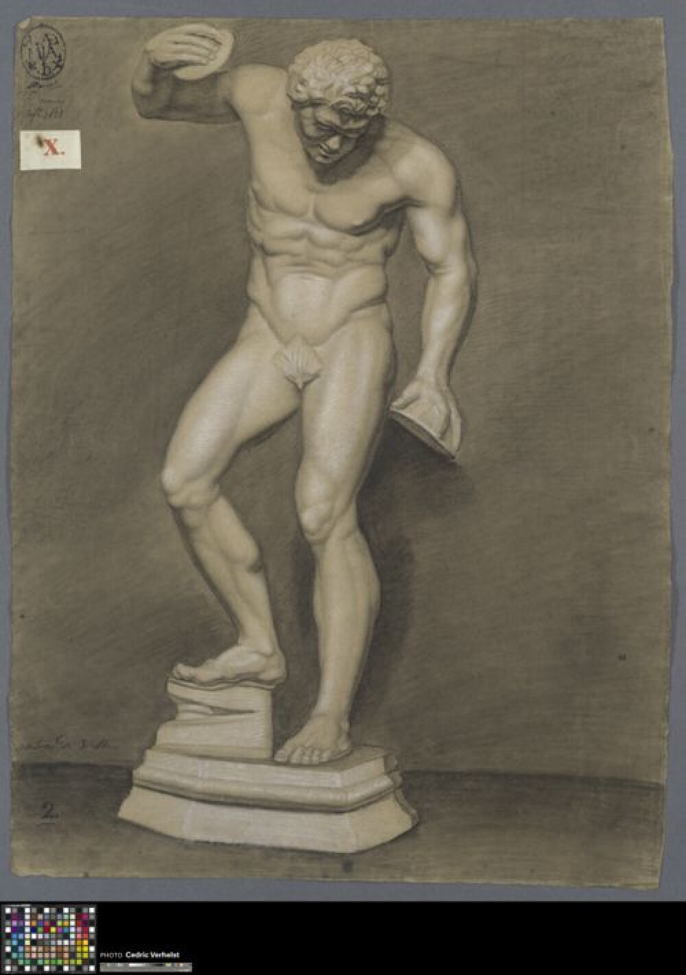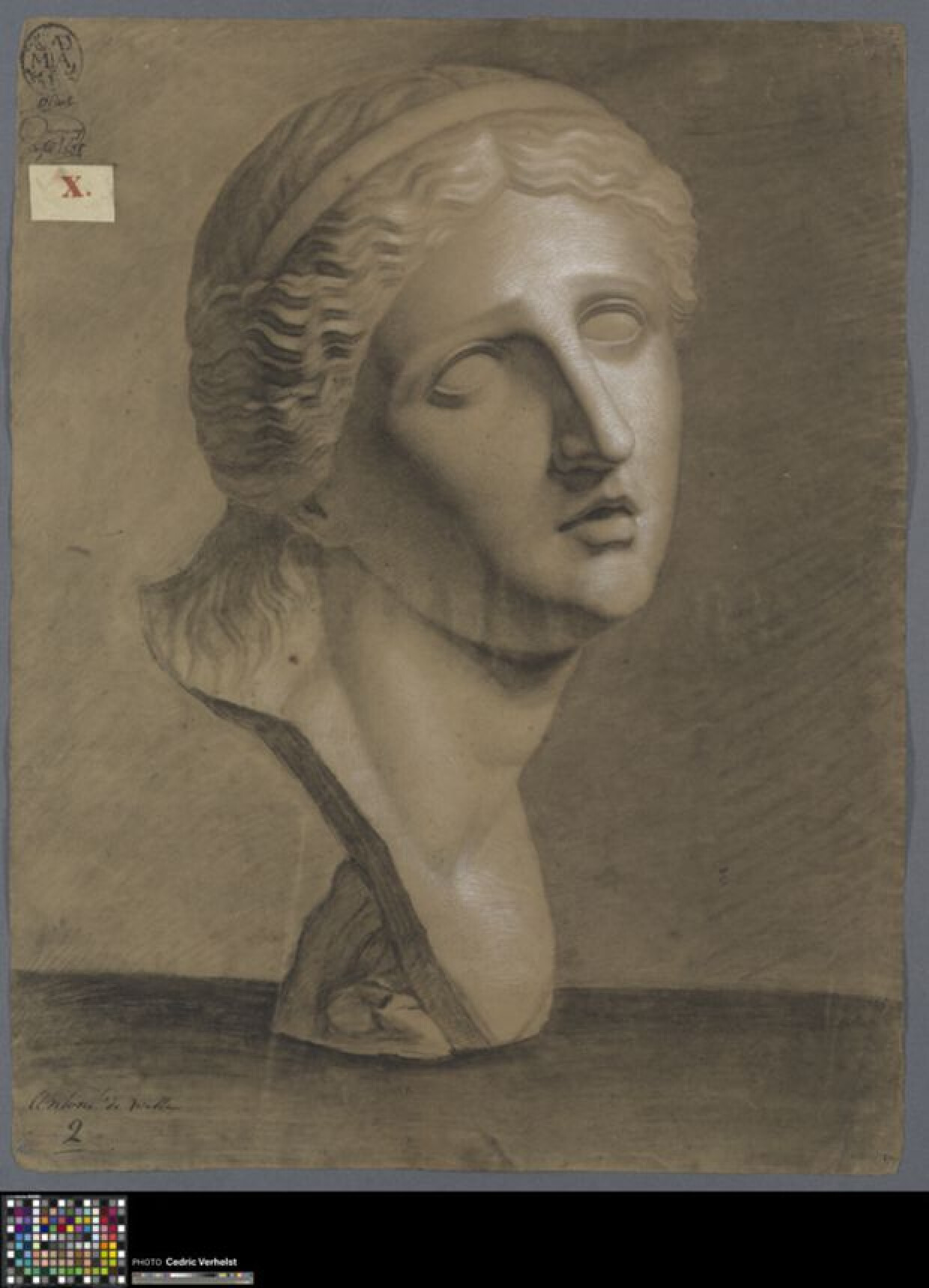 19de eeuwAcademische studie naar sculptuur van Niobe, getekend door Antonius De Witte in 1835. De Witte maakte deze studie als leerling in de klas naar 'het plaester' of sculptuur aan de Academie Brugge. Hij nam deel aan de wedstrijd en won de tweede prijs van zijn klas, voorgegaan door Bruno van Hollebeke (0016.GRO0222.II). Een buste van Niobe is driekwart naar rechts getekend. Het gaat om een afgietsel van een detail uit het standbeeld van Niobe met haar jongste dochter. De Witte tekende deze studie in zwart krijt of houtskool, gehoogd met wit krijt. De aantekeningen refereren naar de wedstrijddeelname. Linksboven is een etiket verlijmd met daarop de tekenletter van De Witte voor anonieme jurering. Daarboven staat de handtekening van leraar of directeur Dumery en de handtekening van secretaris De Net. Helemaal bovenaan staat de academiestempel. De behaalde prijs werd linksonder genoteerd. De Witte maakte nog een tweede studie: 0022.GRO0706.II.