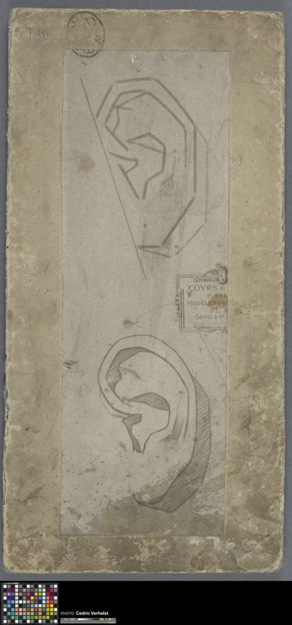 19de eeuwAcademische prent met een studie van oren, verlijmd op een steunkarton. De krijtlithografie komt uit de Cours de Dessin van Charles Bargue, uitgegeven bij Goupil en Compagnie in 1867. Het gaat om een fragment van Plaat 4 uit het eerste deel "Modèles d'après la Bosse". Er zijn twee oren afgebeeld op de prent: bovenaan een lijntekening met de hoekige basisvorm van het oor; daaronder hetzelfde oor in rondere lijnvoering met schaduwpartijen. Tussen de oren is het titelschild nog gedeeltelijk leesbaar. In de Academie Brugge werden de krijtlitho's van Bargue als lesmateriaal gebruikt voor de beginnersklassen. Er waren meerdere exemplaren van dezelfde prent aanwezig (cf. 0022.GRO0822-824.III en 0022.GRO0828-829.III). Deze prenten zijn allemaal afgesneden en gemonteerd op karton.