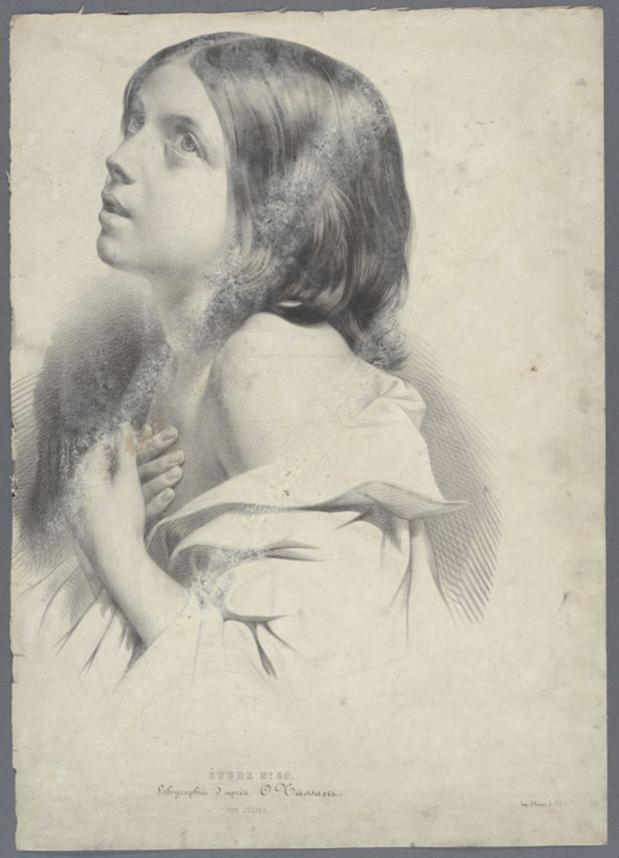 19de eeuwAcademische prent van een meisje, afkomstig van de Academie Brugge. Een meisje is tot aan de borst, in profiel naar links weergegeven. Ze draagt een wit hemd dat van haar schouders afhangt. Ze houdt haar handen over elkaar heen op de borst en haar blik is omhoog gericht. Het gaat om een lithografie van Julien, naar een ontwerp van Tassaert en gedrukt bij Aubert & Cie. De prent is gedrukt in zwarte inkt en links afgesneden doorheen de voorstelling. Ze werd aan de academie gebruikt als didactisch materiaal in de eerste klas naar prenten. In de klassen naar prenten tekenden leerlingen prenten tot in het kleinste detail over. De datering van de prent kan geschat worden tussen het gebruik van het opschrift 'Imp. d'Aubert & Cie' (ca. 1840) en de wedstrijdstudie getekend door Edouard Rousseau (1853), zie 0014.GRO0007.62.II.