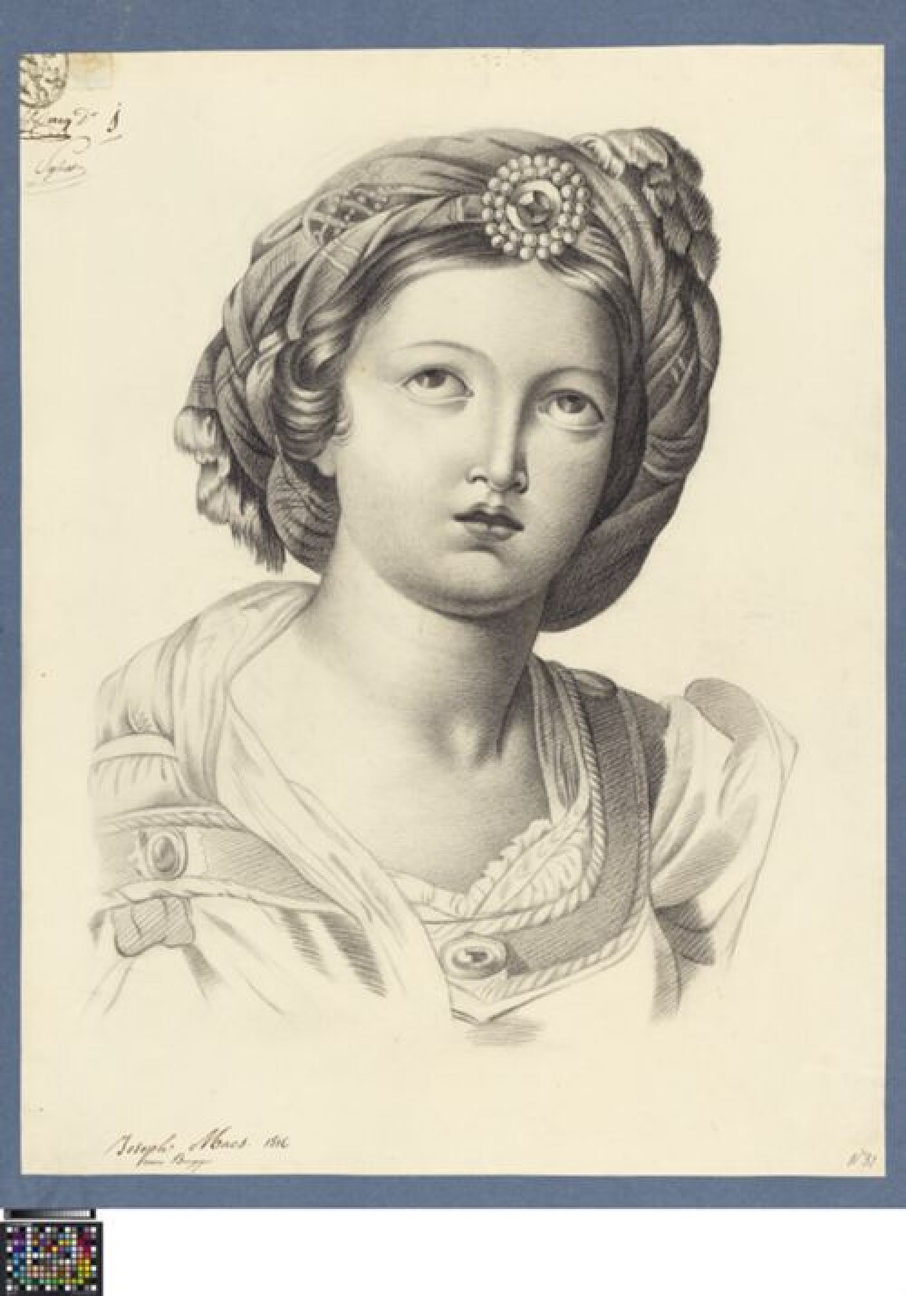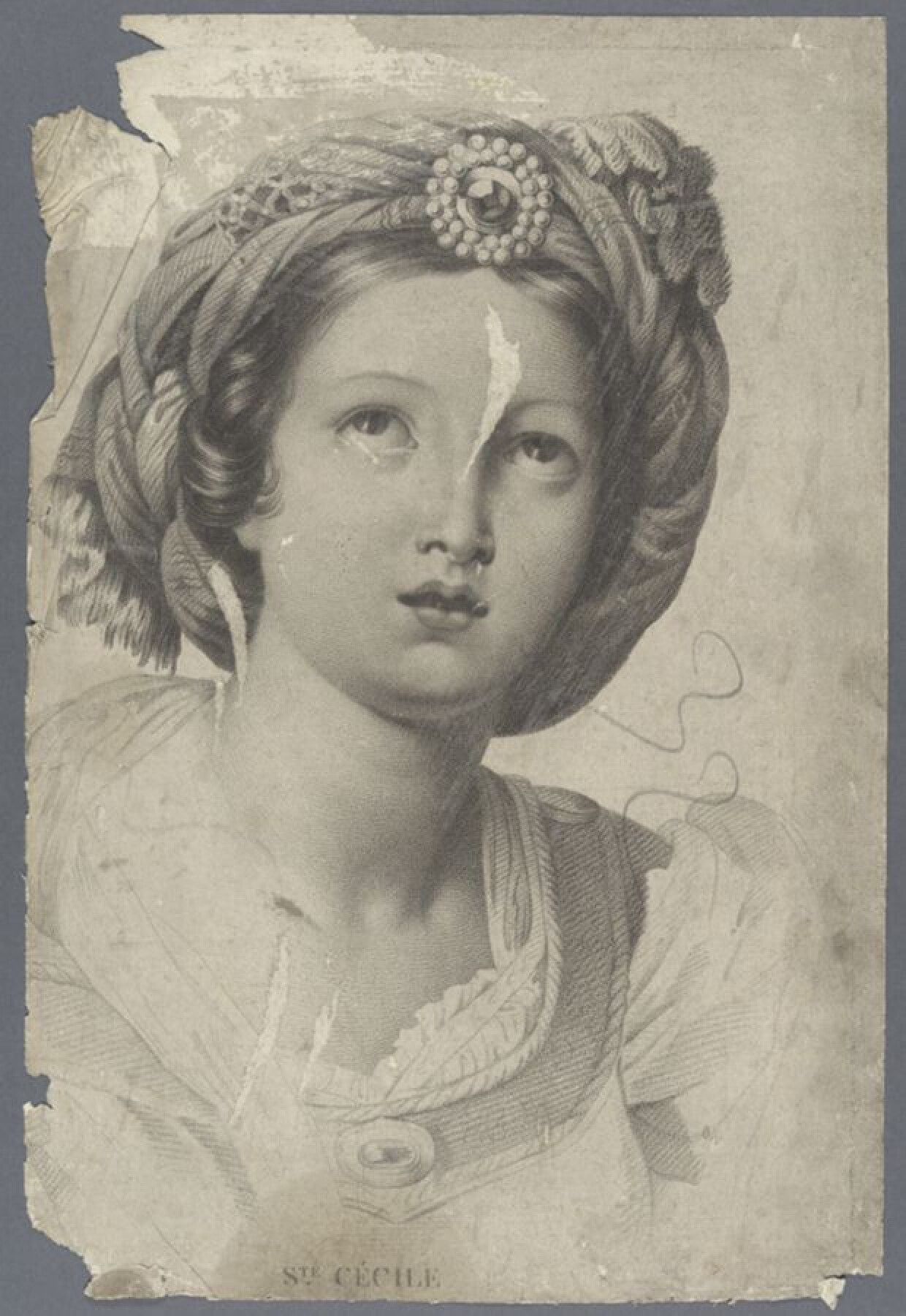19de eeuwAcademische prent naar het schilderij 'Sainte Cécile avec un ange tenant une partition musicale' van Domenichino. De prent toont de heilige Cecilia tot aan de borst, frontaal weergegeven. Ze draagt een tulband met versierde medaillon en kijkt omhoog. Aan de Academie Brugge werd deze prent gekopieerd door leerlingen uit de tweede klas naar prenten, ook wel 'grote kop' genoemd. Het gaat om een ets in crayonmanier, gedrukt in zwarte inkt op gevergeerd papier. De plaatrand is enkel nog bovenaan en rechts te zien. Het papier werd wellicht bijgesneden, waardoor een deel van de voorstelling en informatie over de vervaardiging verloren gingen. Hierdoor is het dus onduidelijk uit welke reeks deze prent afkomstig zou zijn, en wie de prentmaker of uitgever is. Onderaan is enkel het opschrift 'S.te Cécile' te zien.