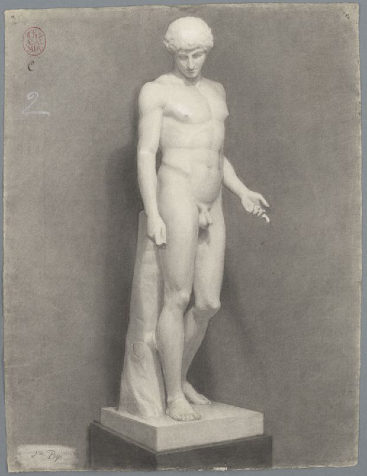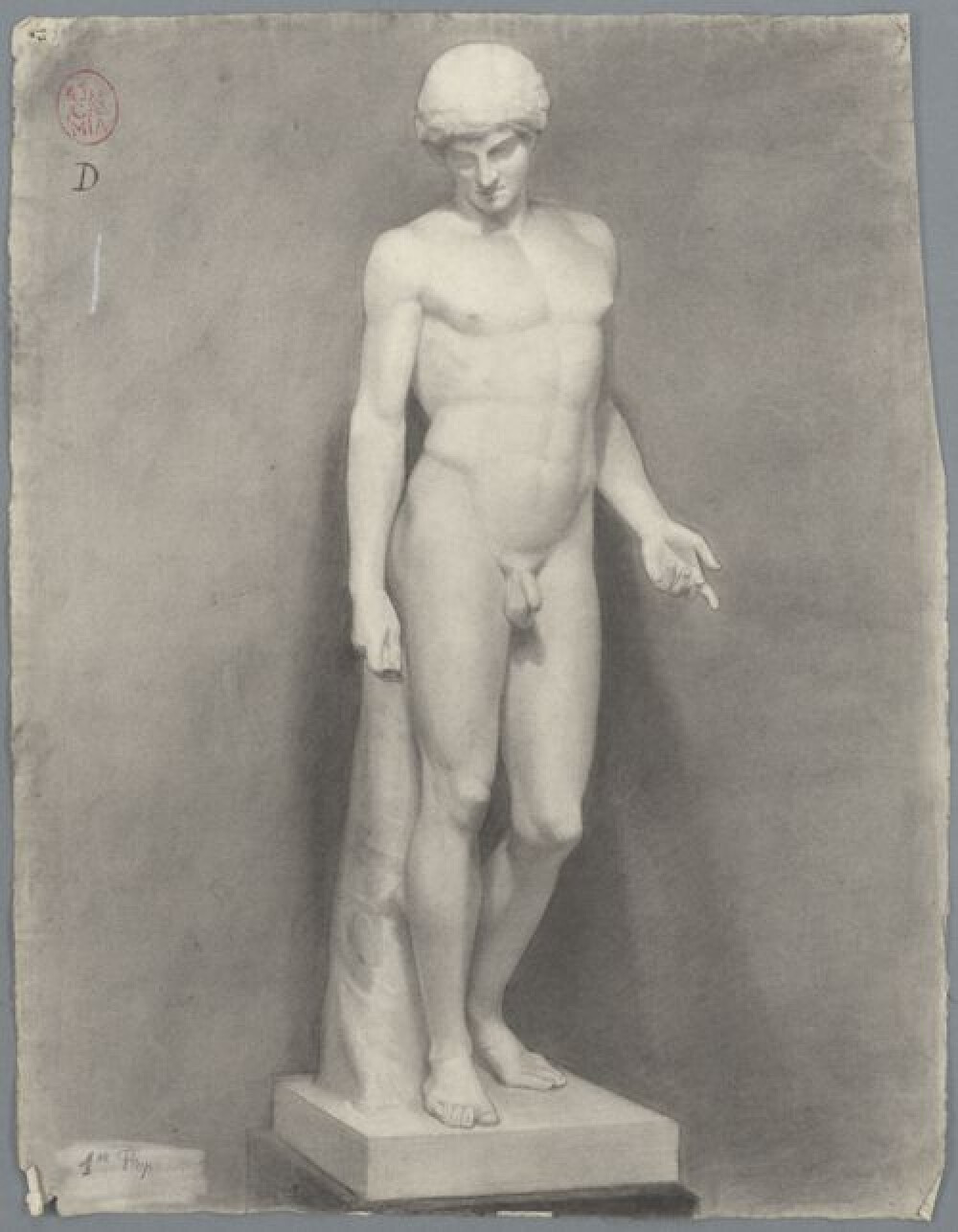 19de eeuw 20ste eeuwDeze anonieme academische studie naar een sculptuur beeldt een jonge man af in contrapost, steunend op het rechterbeen. Hij houdt zijn linkerarm gebogen, met wijsvinger en duim uitgestoken. In zijn rechterhand houdt hij een klein, onbekend object vast dat op een stokje lijkt. De sculptuur is waarschijnlijk een gipsen kopie van de Capitolijnse Antinoüs. Antinoüs was de jonge geliefde van de Romeinse keizer Hadrianus. Ondanks de titel van het beeld bestaat er twijfel of de sculptuur daadwerkelijk Antinoüs weergeeft. Hoewel de jeugdigheid en de krullende haren typerend zijn, zou het beeld te geïdealiseerd zijn om hem af te beelden. Daarom is er ook een vermoeden dat het de Griekse god Hermes voorstelt. Deze studie werd getekend in zwart krijt of houtskool, gehoogd met wit krijt, op gevergeerd papier met het watermerk "MBM". De aantekeningen wijzen op deelname aan een wedstrijd. Rechtsboven is de academiestempel in rode inkt zichtbaar, met daaronder de toegewezen letter "C". Hieronder staat in wit krijt het cijfer twee, wat duidt op het behalen van de tweede prijs. Tot slot staat linksonder in potlood "2de prijs" genoteerd. De naam van de vervaardiger is echter niet vermeld.
