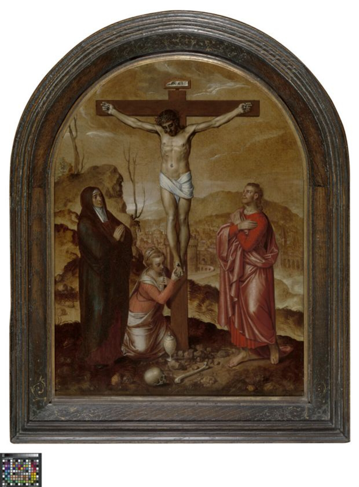 Deze kruisiging schilderde Pieter Pourbus in 1557. Zo blijkt uit zijn monogram en de datering rechtsonder op de steen. De compositie vertoont grote verwantschap met een kruisigingsmedaillon dat is opgenomen in het Van Belle-triptiek in de Brugse Sint-Jacobskerk, dat Pourbus een jaar eerder schilderde. Beide werken hebben een eenvoudige compositie. Het kruis met Jezus is dicht bij het beeldvlak geplaatst, terwijl aan weerszijden van het kruis Maria en Johannes de Evangelist staan. Aan de voet van het kruis knielt Maria Magdalena. Ondanks de overeenkomsten tussen de schilderijen is er geen sprake van een letterlijke herhaling van de voorstelling. Door kleine aanpassingen heeft Pourbus de emotie vergroot en de compositie aangepast aan de mode. Zo buigt Maria Magdalena naar de voeten van Jezus toe en houdt ze met één hand zijn voeten vast, terwijl ze met de andere hand haar sluier bij haar gezicht houdt. Haar kleding en haardracht vertoont invloeden van de renaissance. Ook het landschap dat Pourbus, in tegenstelling tot het Van Belle-triptiek, volledig heeft geschilderd in oker tinten, duidt op nieuwe renaissancistische invloeden.