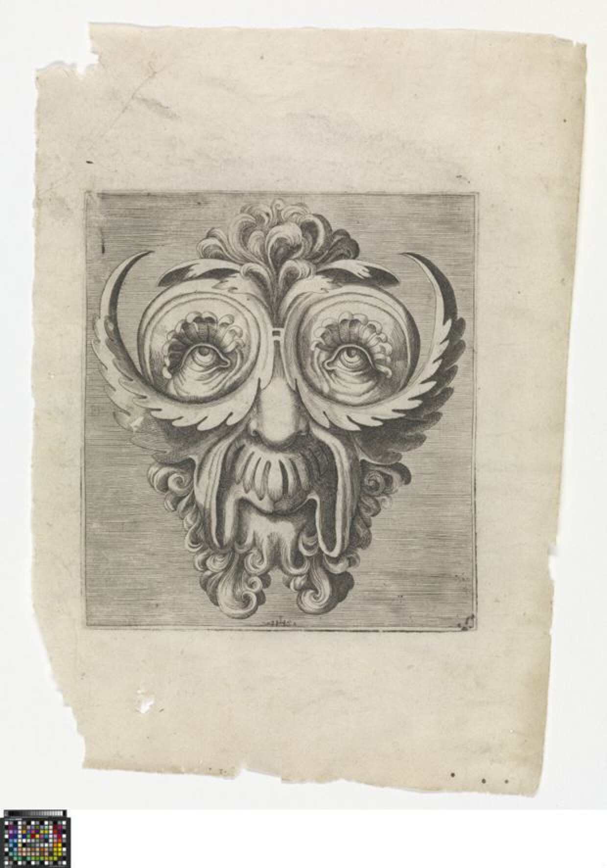 16de eeuwDeze prent behoort tot een serie kopieën naar prenten met groteske maskers, gemaakt door Frans Huys naar ontwerp van Cornelis Floris en uitgegeven door Hans Liefrinck. Volgens Warncke (1979) gaan de maskers terug op decoraties in de Vaticaanse Loggi en het Domus Aurea. De serie was heel populair en is verschillende malen gekopieerd geweest, onder meer door een anonieme Italiaanse graveur die IHS als monogram hanteert (naar De Jong en De Groot, Amsterdam 1988, nr. 78). Deze laatste kopieën zijn samen met enkele nieuwe inventies in 1560 uitgegeven als 'Libro di variate mascare...'. Het titelblad van deze reeks draagt het signatuur 'Renatus B. De serie wordt daarom vaak toegeschreven aan René Boyvin. De hier besproken prent is een dergelijke kopie.
