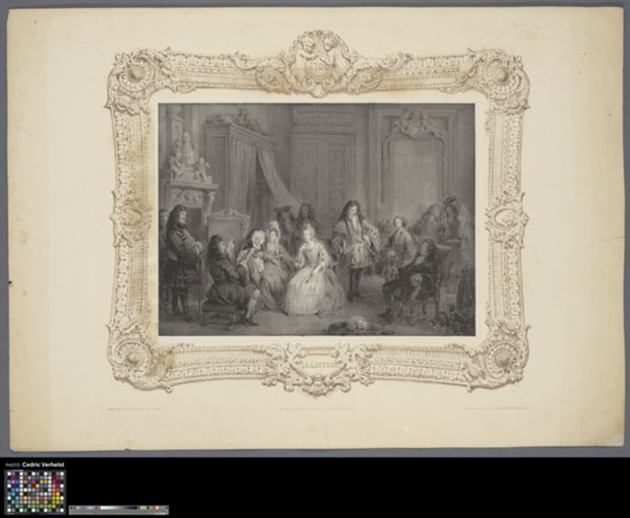 19de eeuwDe voorstelling bevindt zich binnen een bruine cartouche die reeds op het papier stond voordat de prent werd gedrukt. De cartouche bestaat uit antieke motieven en bovenaan in een rocaille staat het jaartal 1700. Links zit een man op een stoel die expressief voorleest uit een boek. De andere personages richten hun aandacht op hem. Het interieur en de mode van de mensen is vroeg 18e-eeuws.
