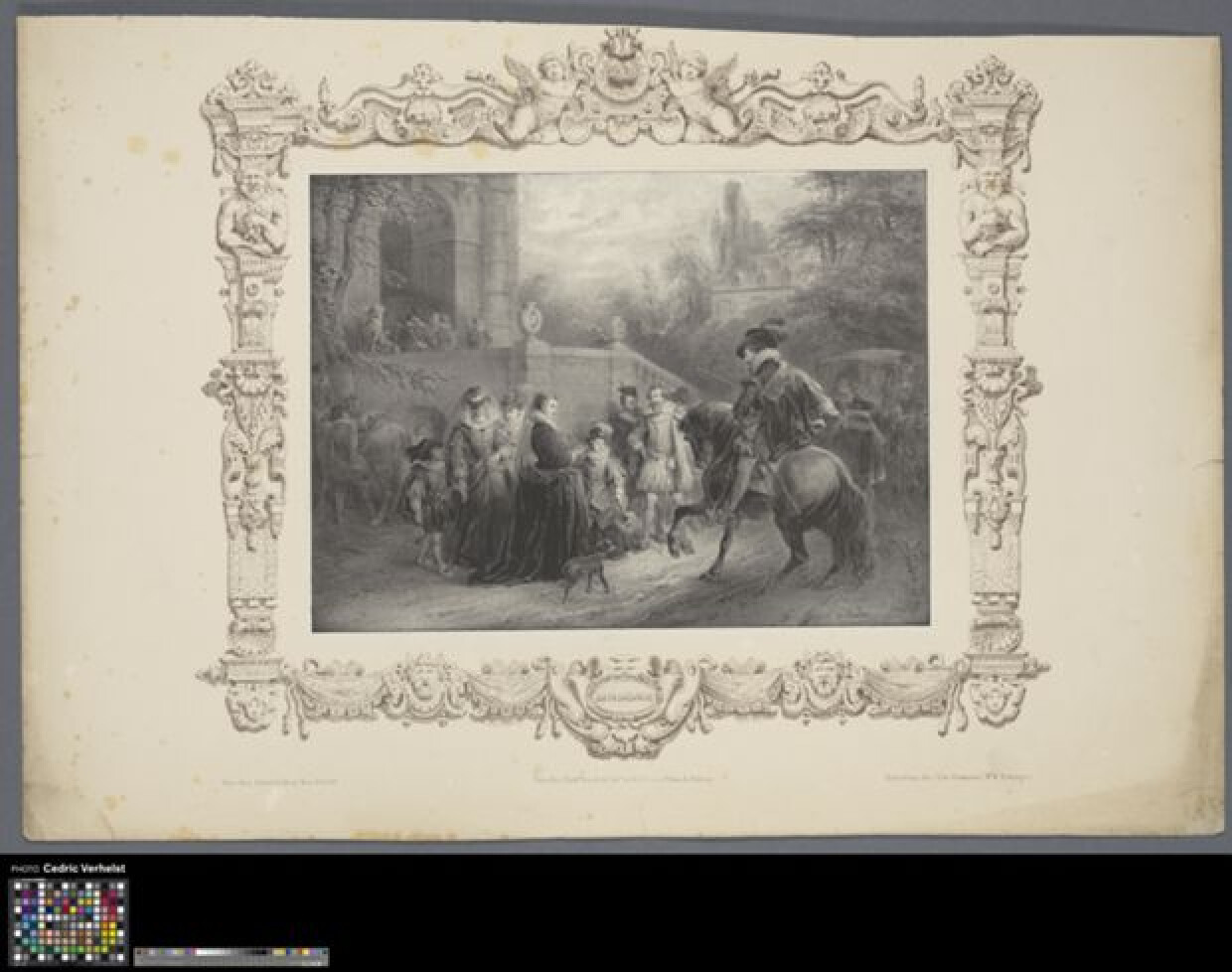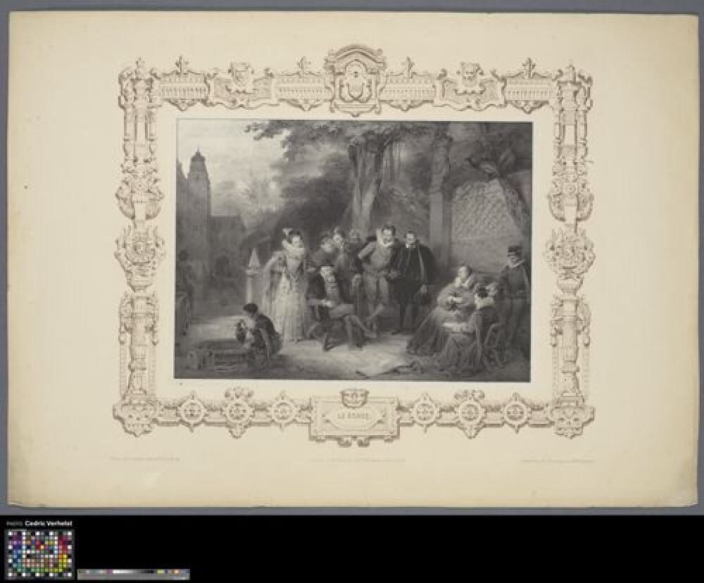 19de eeuwDe voorstelling bevindt zich binnen een bruine cartouche die reeds op het papier stond voordat de prent werd gedrukt. De cartouche bestaat uit antieke motieven en bovenaan staat het jaartal 1600. De voorstelling toont een tafereel in openlucht met opgeklede mensen, enkele paarden en achteraan een kar.