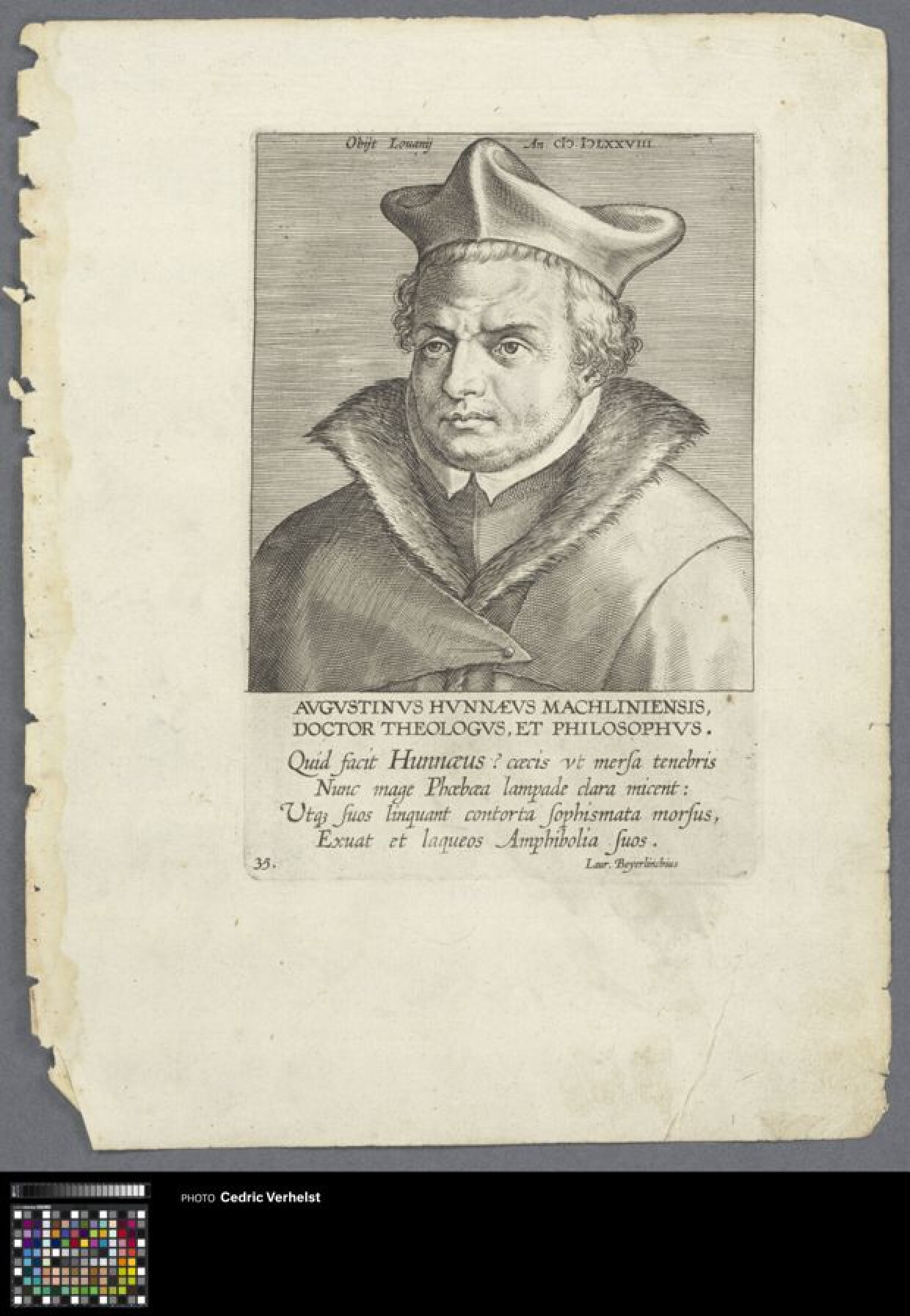 17de eeuwPortret van filosoof Augstinus Hunaeus in buste naar links. Gebruikt als boekillustratie in o.a.: Aubert Le Mire, Illustrium Galliae Beglicae scriptorum icones et elogi, 1604.
