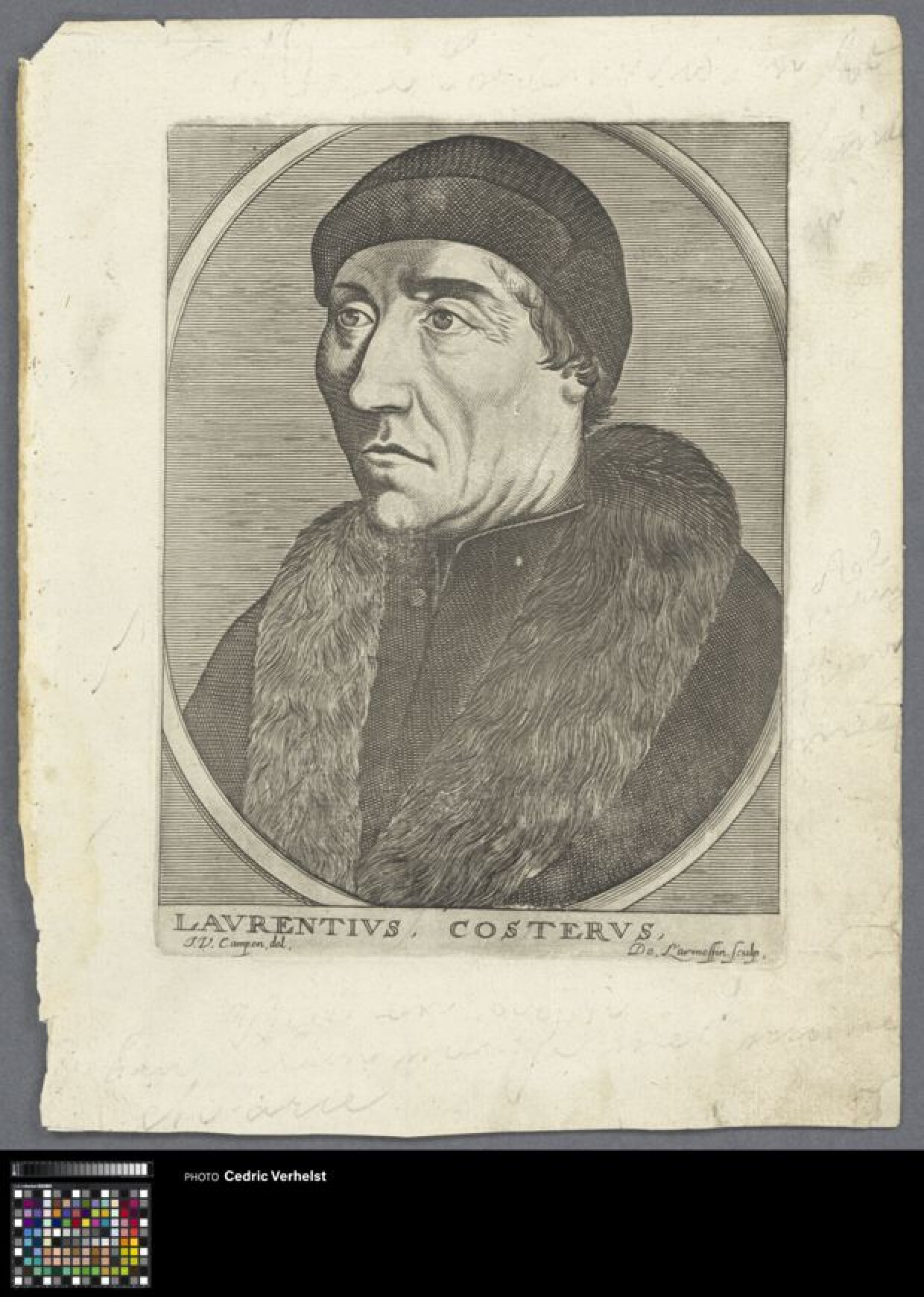 17de eeuwPortret van Laurens Janszoon Coster in buste naar links. Boekillustratie uit: Bullart, Isaac. Académie des Sciences et Arts contenant les vies et éloges his. des hommes illustres qui ont excellé en ces professions depuis environ quatre siècles. Brussel: François Foppens, 1682. Met uitgewiste aantekeningen in potlood rond de prent.