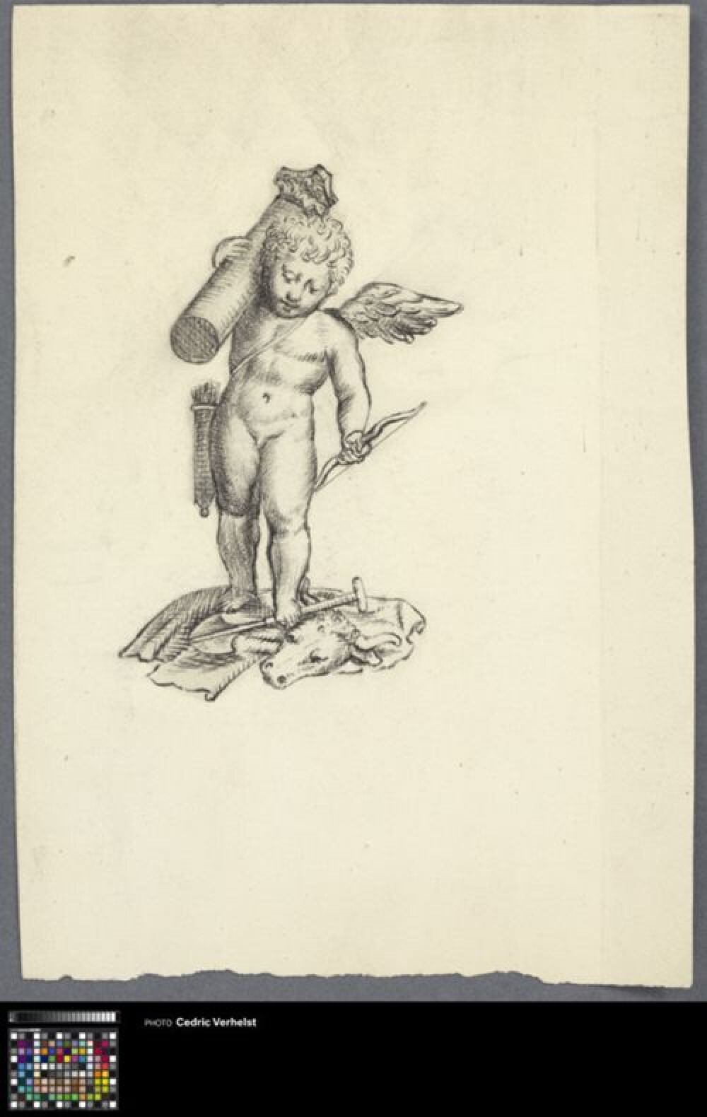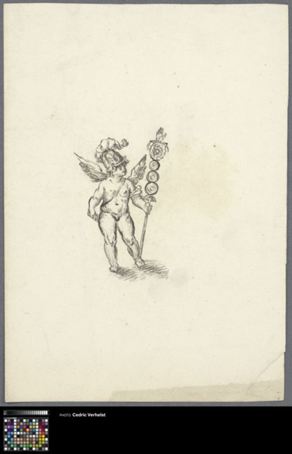 Staande cupido. De tekening is vermoedelijk verwant aan andere tekeningen met cupidofiguren uit dezelfde schenking door Guy Van Hoorebeke. Zie ook 2014.GRO0064.II-2014.GRO0067.II.