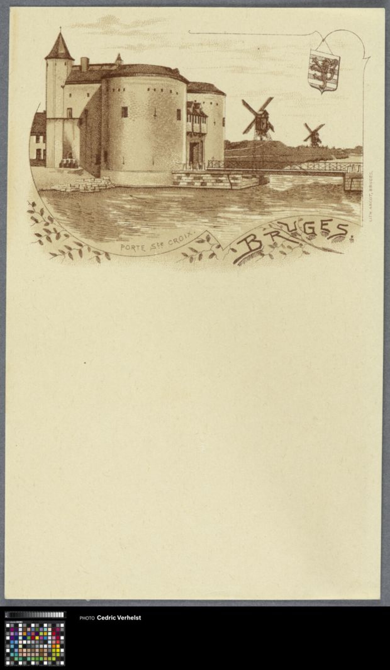 19de eeuwSamengevouwen papier dat zo vier bladzijden vormt, waarvan enkel de eerste bovenaan bedrukt is. Mogelijks diende het als een prentbriefkaart met veel plaats om een tekst te schrijven. De voorstelling toont de kruispoort van buiten de vesten. In de achtergrond staan windmolens. Bovenaan rechts hangt het wapen van Brugge.