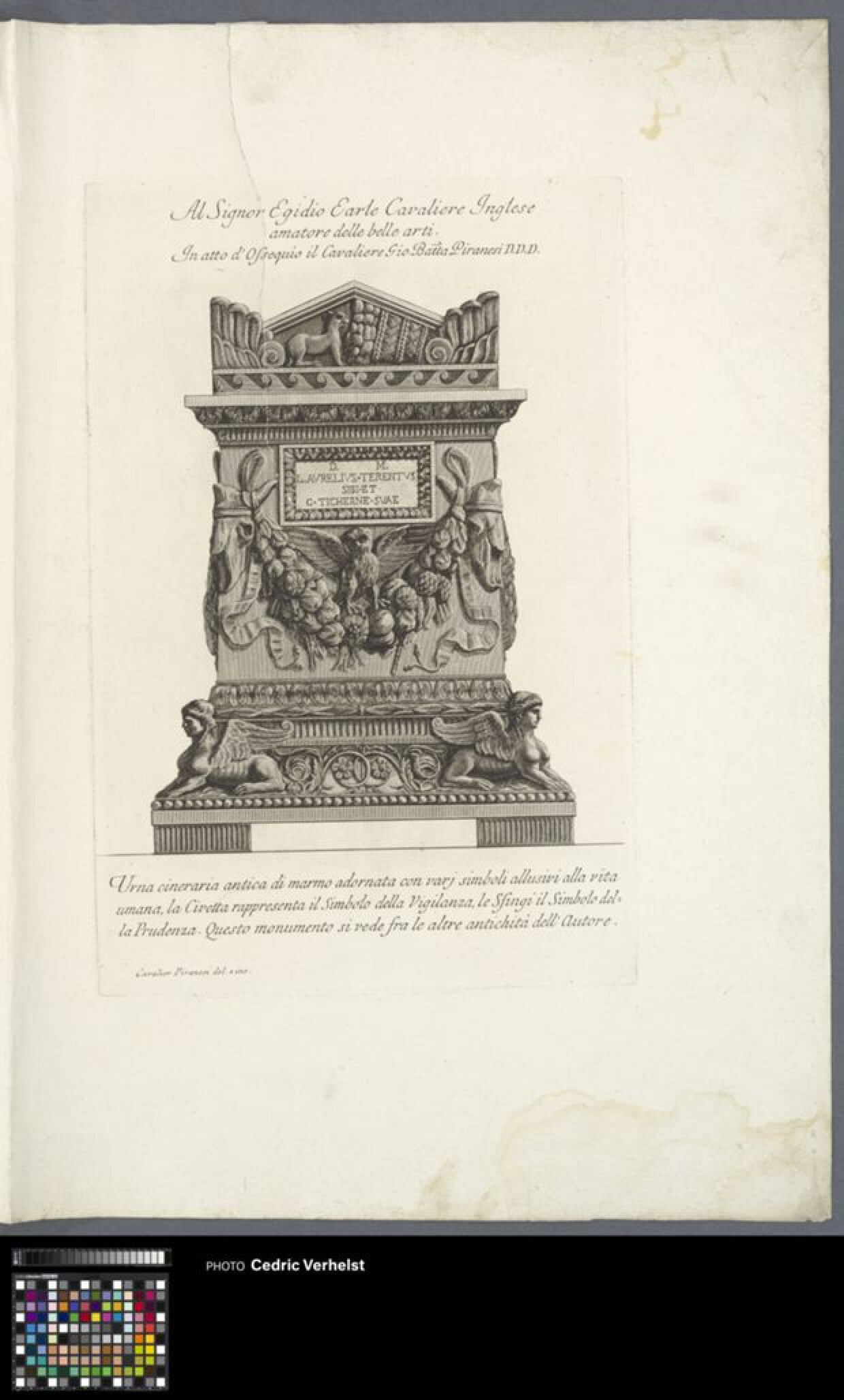18de eeuwDeze prent behoort tot de reeks 'Vasi, candelabri, cippi, sarcofagi, tripodi, lucerne, ed ornamenti antichi disegnati ed incisi dal Cav. Gio. Batt. Piranesi'. Het gaat om een druk die de eerste genummerde uitgave van deze prentenreeks in 1778 voorafgaat.
