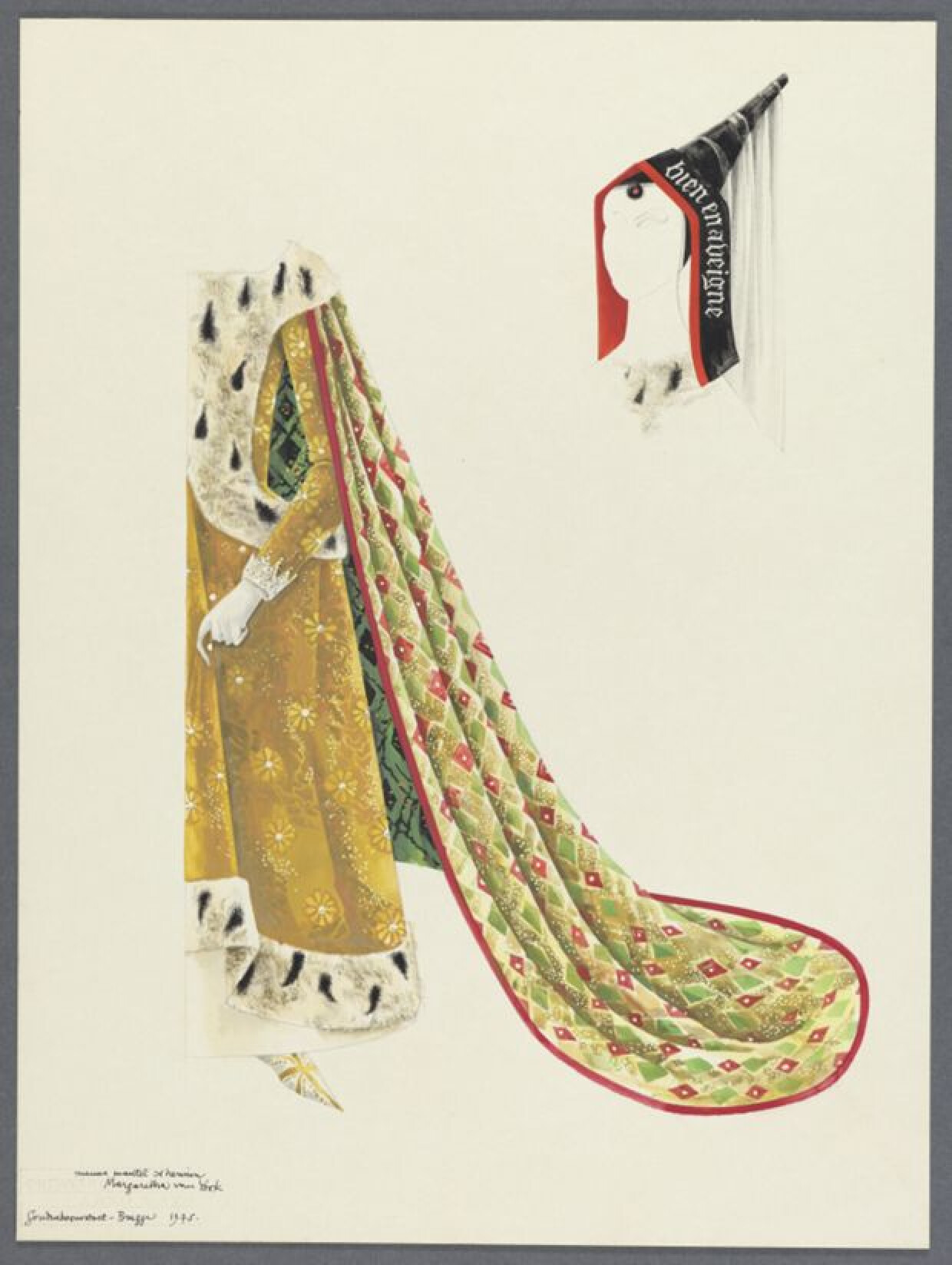 20ste eeuwArno Brys, Brugs tekenaar, graficus en ontwerper, verkreeg vooral bekendheid als ontwerper voor stoeten en processies. Zo ontwierp hij van 1955 tot in de jaren 1990 kostuums, reuzen, vlaggen, decors, praalwagens, affiches en grafiek voor de Praalstoet van de Gouden Boom, de Heilig Bloedprocessie in Brugge en andere historiserende optochten en openluchtspektakels.Ontwerp voor de Praalstoet van de Gouden Boom, 1975: Margaretha van York (deel 3, tafereel VII: Hertogin Margaretha van York, groep 85: de hertogin en haar edeldames)