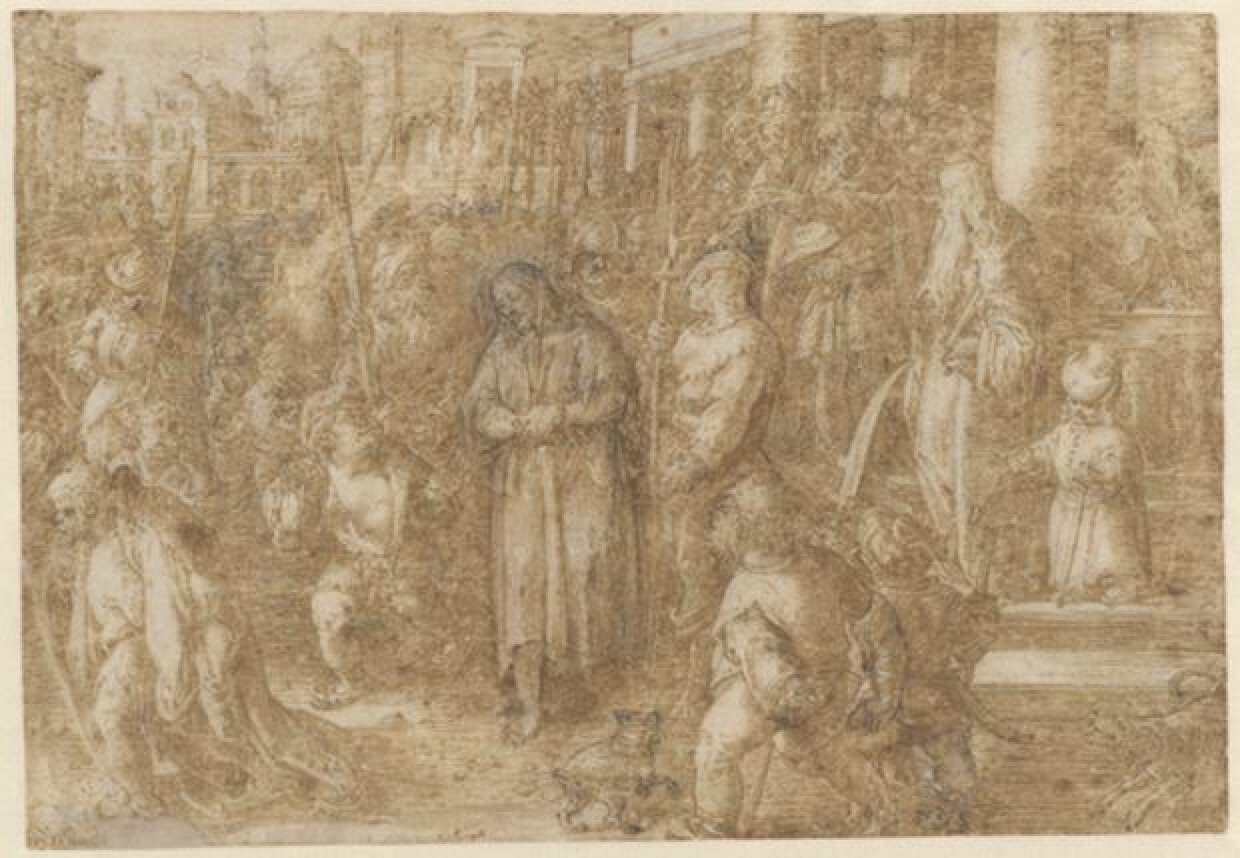 16de eeuwVoorstelling van Herodes die Christus terugzendt naar Pilatus. Christus wordt omringd door soldaten. Op de voorgrond zijn er twee honden afgebeeld. Rechts wordt Herodus afgebeeld, die met de vinger op Christus wijst. Herodus en Pilatus vinden een gemeenschappelijke vijand in Christus. De tekening is linksonder gesigneerd. De tekening behoort tot een reeks met de Passie van Christus. Hiernaast behoren nog drie andere bladen uit de collectie van Caloen tot deze reeks (2022.GRO1957.II, 2022.GRO1958.II en 2022.GRO1959.II). Het zijn varianten van een reeks van in totaal 39 ontwerpen van Stradanus, die in de Uffizi in Florence worden bewaard. Ze sluiten qua afmetingen en voorstellingen nauw aan bij deze ontwerpen. Ze hebben tot voorbeeld gediend voor de prentserie “Passio, Mors et Resurectio Dn. Nostri Jesu Christi”, in Antwerpen gegraveerd door Philips Galle (1537-1612). De tekeningen uit de collectie van Caloen zijn voor deze serie bedoeld, maar werden uiteindelijk niet gegraveerd. De tekeningen zijn afkomstig uit de collectie D'Aigremont. De tekeningen zijn uitgevoerd in de karakteristieke tekentechniek van Stradanus: pentekeningen met zware arceringen in bruin, soms met wit gehoogd en met belangrijke correcties die aangebracht zijn op opgeplakte stukjes papier. De tekening is in langdurig bruikleen van de Stichting Jean van Caloen (inv. nr. VCL 1802). Gebaseerd op: Delineavit & Sculpsit", nov. 1997, nr 3. Gepubliceerd in: Alessandra Baroni Vannucci, Jan Van Der Straet detto Giovanni Stradano, Milano 1997, nr 413 (ill.).
