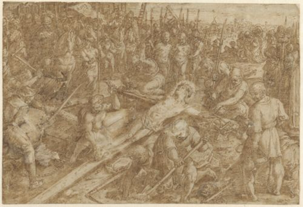 16de eeuwOp de voorgrond worden verschillende figuren afgebeeld die bezig zijn met het vervaardigen van het kruis. Op de achtergrond zien we hoe Christus wordt ontdaan van de purperen mantel, die ze hem eerder aandeden tijdens de geseling om de spot te drijven. De purperen mantel verwijst naar een koningsmantel. De prent is linksonder gesigneerd met "Stradanus", het alias van Jan van der Straet. De tekening behoort tot een reeks met de Passie van Christus. Hiernaast behoren nog drie andere bladen uit de collectie van Caloen tot deze reeks (2022.GRO1956.II, 2022.GRO1957.II en 2022.GRO1959.II). Het zijn varianten van een reeks van in totaal 39 ontwerpen van Stradanus, die in de Uffizi in Florence worden bewaard. Ze sluiten qua afmetingen en voorstellingen nauw aan bij deze ontwerpen. Ze hebben tot voorbeeld gediend voor de prentserie “Passio, Mors et Resurectio Dn. Nostri Jesu Christi”, in Antwerpen gegraveerd door Philips Galle (1537-1612). De prentenreeks werd echter niet uitgevoerd. De tekeningen zijn afkomstig uit de collectie D'Aigremont. De tekeningen zijn uitgevoerd in de karakteristieke tekentechniek van Stradanus: pentekeningen met zware arceringen in bruin, soms met wit gehoogd en met belangrijke correcties die aangebracht zijn op opgeplakte stukjes papier. De tekening is in langdurig bruikleen van de Stichting Jean van Caloen (inv. nr. VCL 1804). Gebaseerd op: “Delineavit & Sculpsit", Nov. 2017, nr 5. Gepubliceerd in: Alessandra Baroni Vannucci, Jan Van der Straet detto Giovanni Stradano, Milano, 1997, nr 417 (ill.).