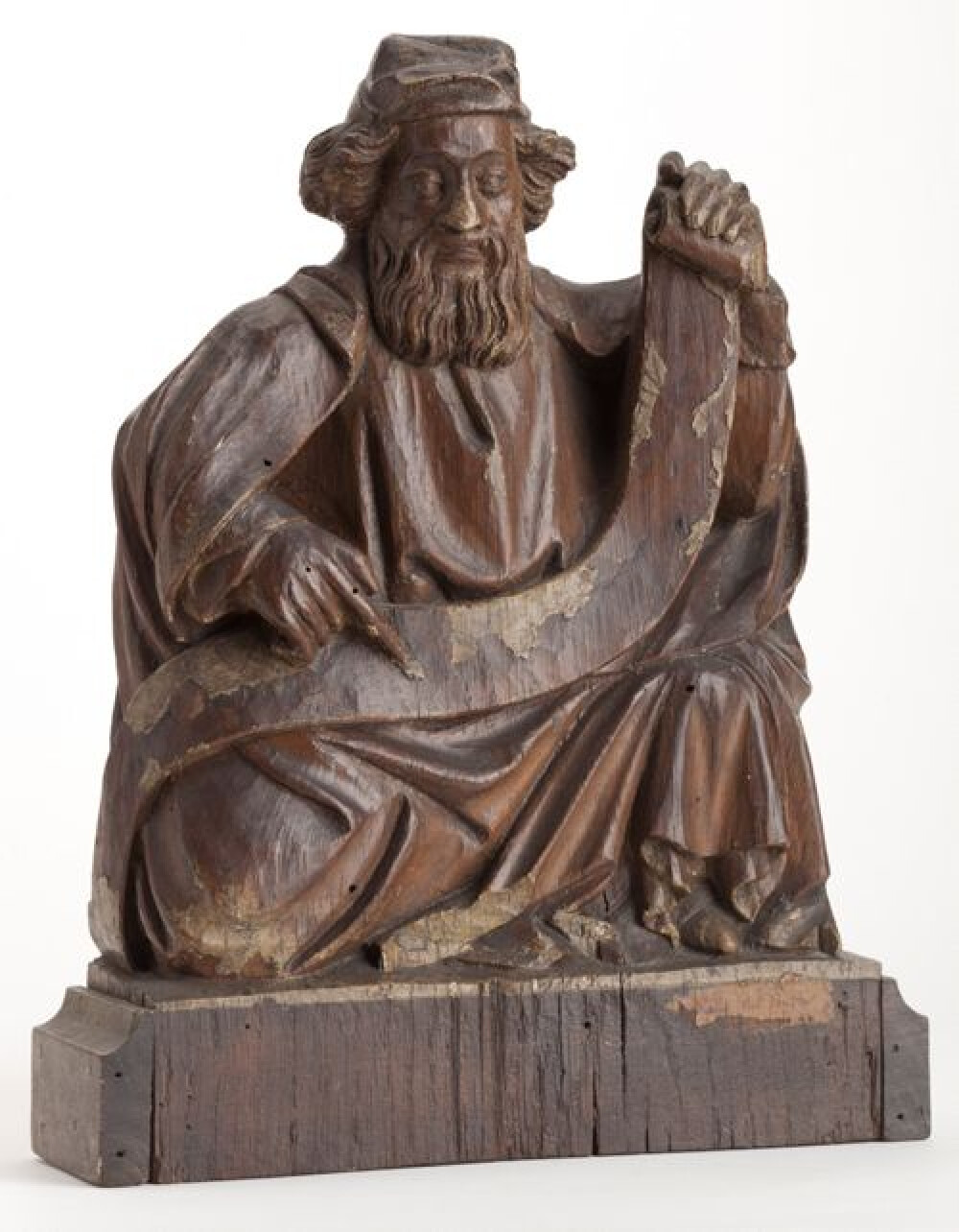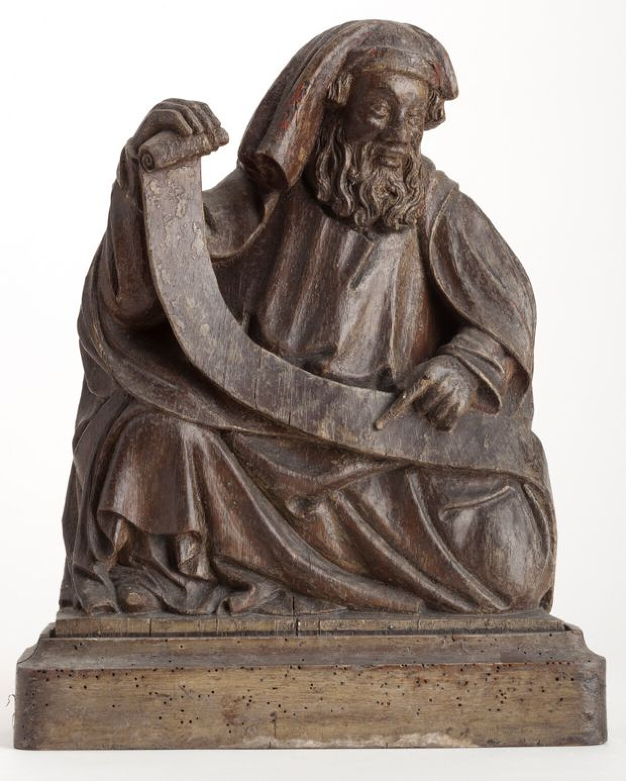 15de eeuwDeze balksleutel ontstond wellicht in een Brugs atelier. In de Gruuthusecollectie is een soortgelijke balksleutel te vinden die eveneens een profeet voorstelt (V.O.0132). Op basis van stijlkenmerken kunnen beiden in de vroege vijftiende eeuw worden gedateerd. Beide oudtestamentische mannenfiguren houden een lange banderol voor zich, waarop ze wijzen met respectievelijk de rechteren de linkerhand. Op de banderollen stond oorspronkelijk ongetwijfeld een tekst waardoor de profeten konden worden geïdentificeerd. Hun kledij en haartooi zijn gelijk. Ze zijn min of meer complementair aan elkaar, maar maakten waarschijnlijk deel uit van een groter ensemble.