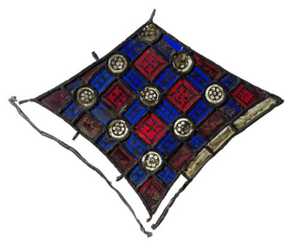 Glasraamfragment met een gebrandschilderd patroon van afwisselend geometrische bolmotieven op paars glas, bladmotieven op groen glas en en rozetten op geel glas. Rand van wit glas in resten van origineel lood.