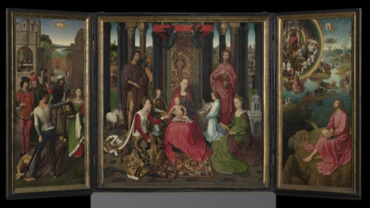 15de eeuwDe zusters en broeders van het hospitaal gaven Hans Memling meer dan 500 jaar geleden de opdracht voor dit imposante drieluik, een altaarstuk voor de kerk van het hospitaal. Ze zijn te zien op de buitenluiken en in het midden. Op het centrale paneel, tussen de zuilen, staat de houten kraan van Brugge die gebruikt werd om wijnvaten van de boten te heffen. Belastingen op invoer van wijn, waren voor het hospitaal. Memling schilderde ook de patroonheiligen en beschermers van het hospitaal: Sint-Jan de Doper met lam en Sint-Jan de Evangelist met de kelk. Rechts, achter een zuil, een broeder in lange zwarte pij.