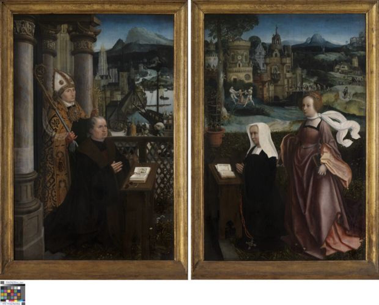 16de eeuwOorspronkelijk waren beide stichtersportretten de binnenzijden van de luiken van een triptiek. Het middenpaneel is zoek. De buitenzijde toont 'de Gierigaard en de Dood' (0218). De luiken werden op een niet bepaald tijdstip in de dikte doorgezaagd. De stichter, links, zit geknield voor een bidbank in een met planten begroeid besloten hofje met panoramisch uitzicht in de diepte. De scènes in dit landschap hebben betrekking op het leven van de patroonheilige. De H. Nicolaas die de man beschermt, vinden we terug op de havenkade waar hij het lossen van het graan gade slaat. De graanstengels die hij op de voorgrond als attribuut in de linkerhand heeft, houdt verband met de Legenda Aurea (13de eeuw). Hij behoedde de stad Myra van de hongersnood, met graan bestemd voor de keizer. Bij levering, bleek het koren op wonderbaarlijke wijze te zijn aangevuld. De stichteres, rechts, zit geknield voor een bidbank in een met planten begroeid besloten hofje met panoramisch uitzicht in de diepte. De scènes in dit landschap hebben betrekking op het leven van haar patroonheilige. De H. Godelieve van Gistel, kan worden herkend aan haar attribuut: de doek waarmee zij gewurgd werd, is om haar nek geknoopt. Op de brug in de achtergrond gfeeft zij voedsel en kleding aan de armen en is ook haar marteldood weergegeven. De rode anjelieren in de aarden pot, symboliseren de goddelijke liefde en verwijzen wellicht naar de naam Godelieve.