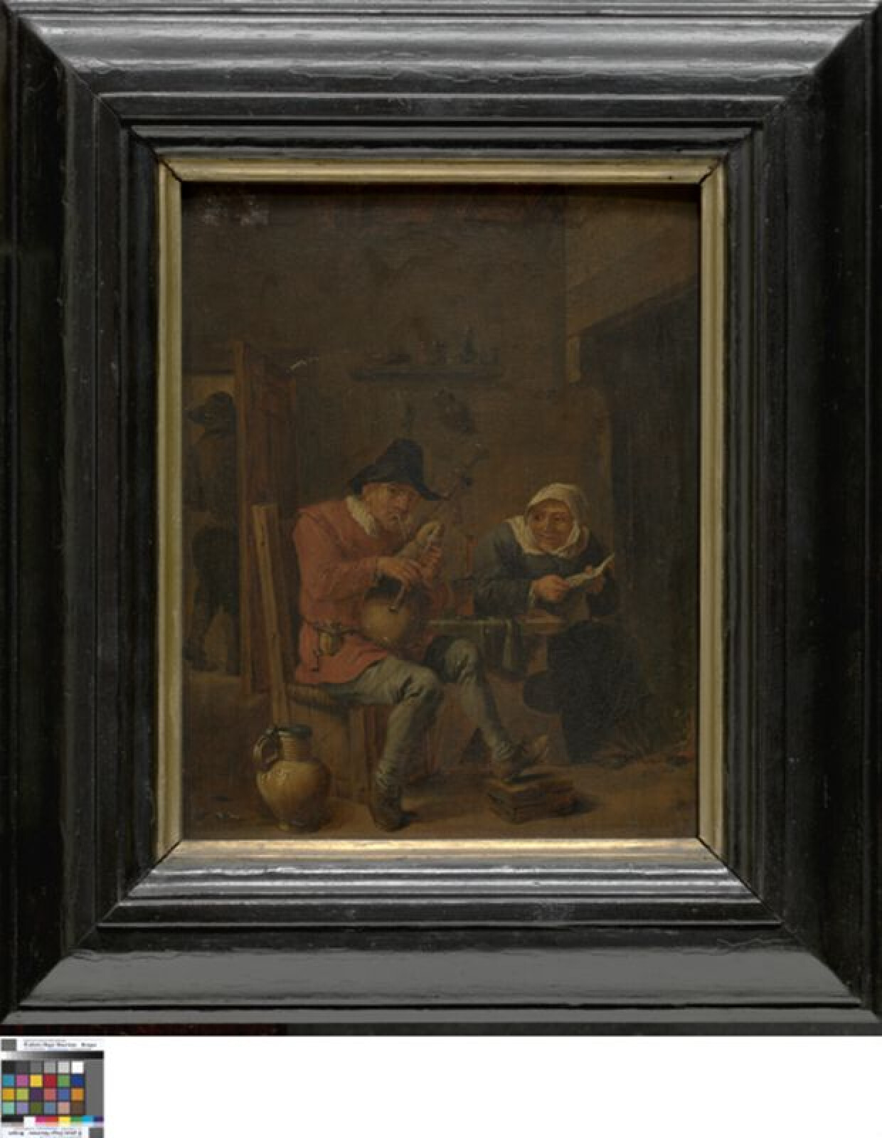 17de eeuwEen oude man en een oude vrouw zitten aan een tafel bij een haard. De man speelt op een doedelzak, slaat de maat met zijn linkervoet en kijkt naar de toeschouwer. De vrouw zingt van een blad en kijkt naar de man. Tegen de muur achter hen hangt een schap met potten. Links een openstaande deur, met een man die het vertrek verlaat. Het werk is een atelierkopie naar een compositie van David Teniers de Jonge. Het thema van het musicerende oude paar werd door Teniers vele malen uitgebeeld, en heeft een oude traditie in de beeldende kunst van de Nederlanden. Dergelijke voorstellingen zijn op verschillende manieren te interpreteren: het kan gaan om een personificatie van het gehoor, om een allusie op de troost die muziek kan brengen, of om de verzinnebeelding van de huwelijksharmonie. Wellicht is de laatste interpretatie hier de meest waarschijnlijke, waarbij het hier zelfs lijkt dat er bijkomend uitgedrukt werd dat de man de toon aangeeft en de vrouw hem volgt.