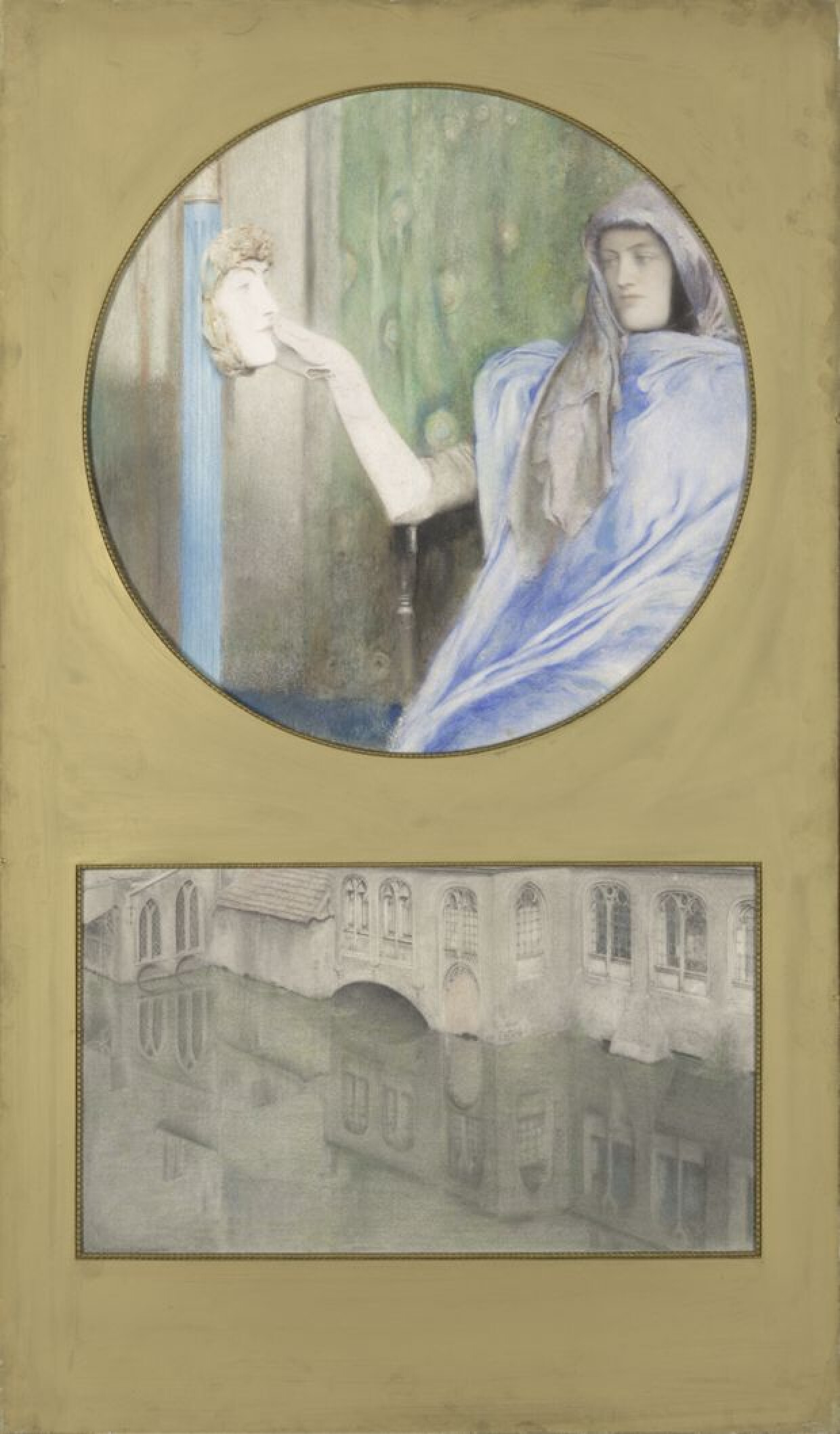20ste eeuwHet werk van Fernand Khnopff betekent een fundamentele verrijking van het Europees symbolisme. In 'Secret-Reflet' behandelt Khnopff motieven die voor het symbolisme kenmerkend zijn. 'Secret' is een beeld van de stilte, gezien verbale communicatie tussen een vrouw en een masker onmogelijk is. In Khnopffs symbolisme is het visualiseren van de realiteit als materiële vorm niet belangrijk, maar wel de vergeestelijkte en verdichte herinnering ervan. Brugge is een belangrijk thema in zijn oeuvre. 'Reflet' toont in een uitsnit een stuk van de gotische gevel van het Sint-Janshospitaal. Door de weerspiegeling in de Reie, is het een illustratie van de spiegelsymboliek. 'Secret' en 'Reflet' werden door Khnopff zelf in een verticaal tweeluik gemonteerd. De afzonderlijke motieven komen ook voor in ander werk van de kunstenaar. Met 'Secret-Reflet' wordt echter een stap verder gezet. De sleutel voor de symbolische betekenis van het geheel ligt in de combinatie van deze twee tekeningen, die ogenschijnlijk niets met elkaar te maken hebben.
