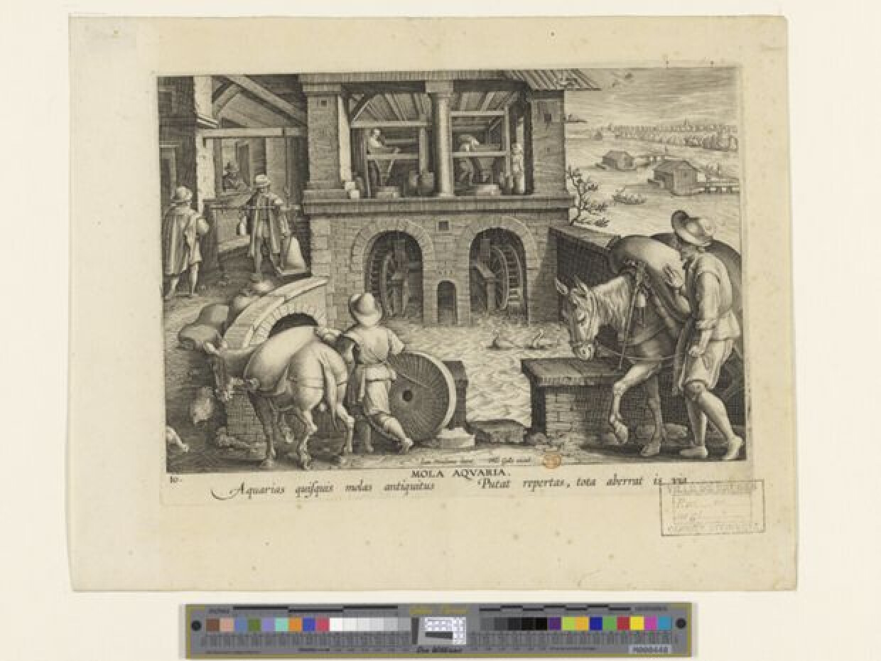 16de eeuwDeze prent toont de watermolen als nieuwe uitvinding van de vroegmoderne tijd. Het is de tiende prent in een reeks van negentien excl. titelprent (New Hollstein, Johannes Stradanus, part III, 322-341, 332.II).