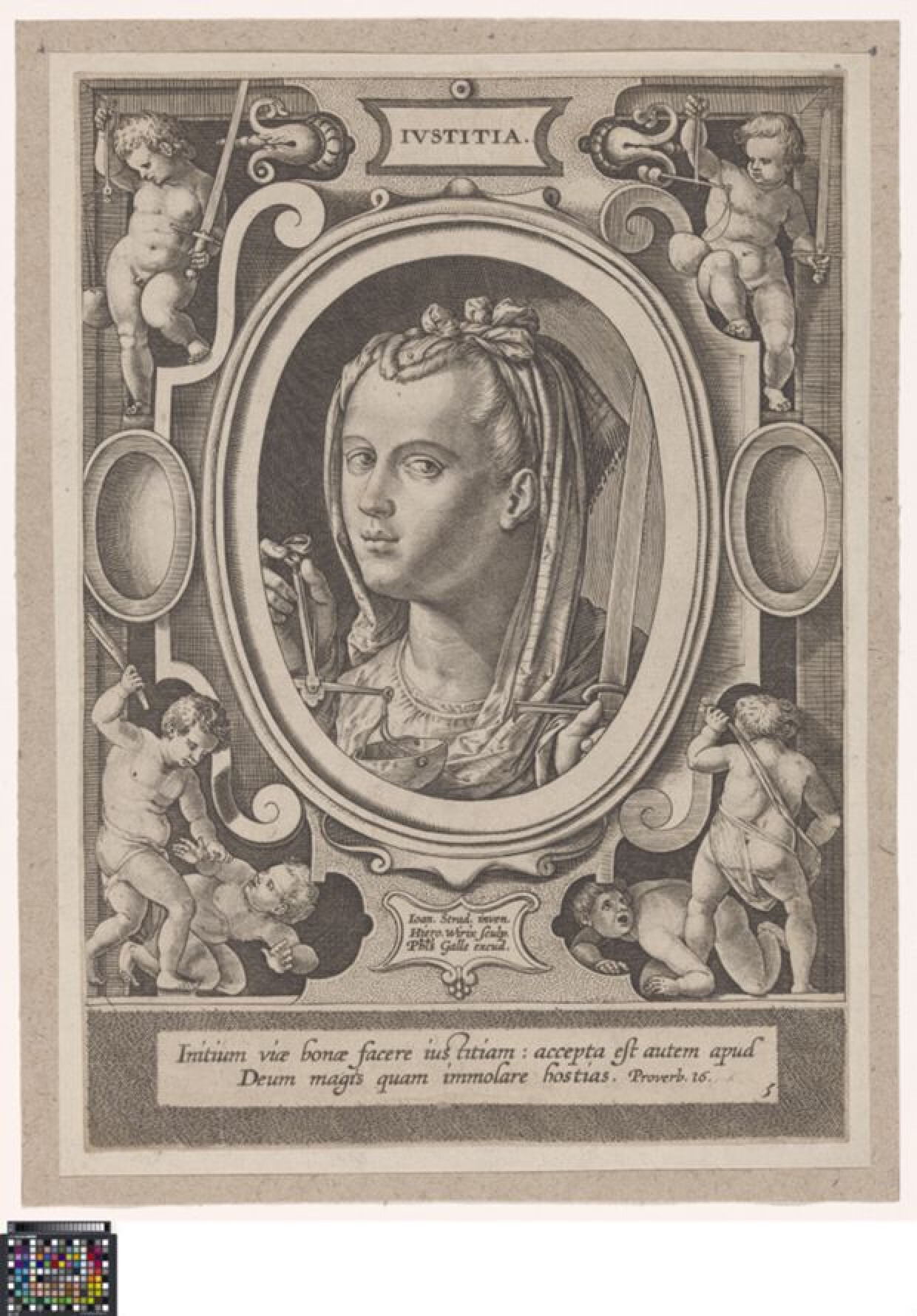 16de eeuwDe prent maakt deel uit van een serie over de zeven deugden bestaande uit een frontispiece en zeven vrouwelijke personificaties van de deugden. De serie is gegraveerd door Hieronymus Wierix naar ontwerpen van Johannes Stradanus en werd uitgegeven door Philips Galle (NH, Johannes Stradanus, 268). Gerechtigheid is afgebeeld met haar traditionele atttributen, een weegschaal en zwaard, in een ovalen omlijsting. Putti in de vier hoeken langs de ovaal illustreren de deugd: in de linker- en rechterbovenhoek staan twee putti met weegschaal en zwaard. Twee putti in de linker- en rechteronderhoek halen uit om een ander te geselen. Onderaan een tweeregelig vers in Latijn gebaseerd op Spreuken 16.