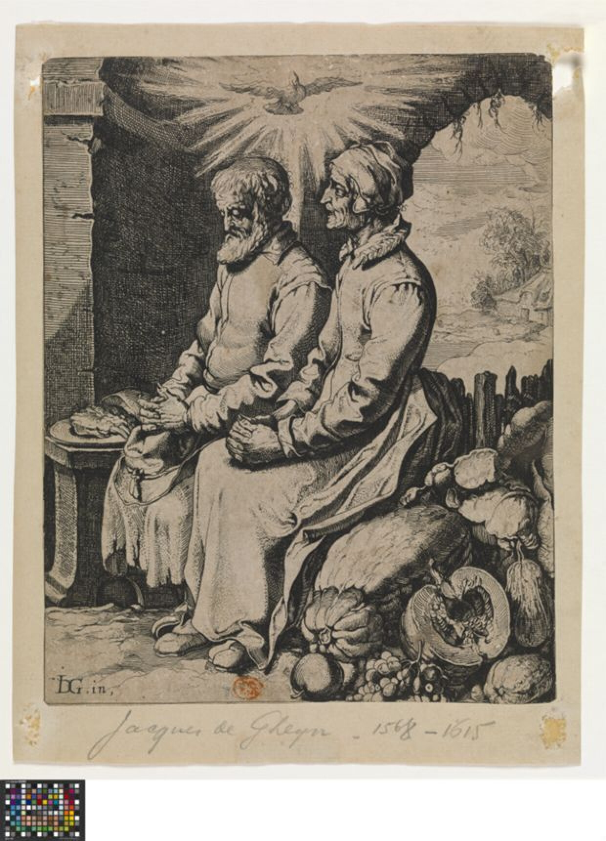 (1595 - 1596)Een oude man en vrouw zittend afgebeeld naar links bij een vervallen gebouw, bidden met gevouwen handen op hun schoot. Boven hen zweeft de Heilige Geest in de vorm van een duif. Rechts van de vrouw ligt een grote stapel pompoenen en kalebassen en een tros druiven. Links van de man staat een schaal met twee stukken vlees. Door de poort in het vervallen bouwsel is zicht op een boerderij. De prent is gemaakt door Jacques de Gheyn III naar ontwerp van Jacques de Gheyn II (New Holl. The De Gheyn Family, part 2, 21). De prent is links onder gesigneerd.