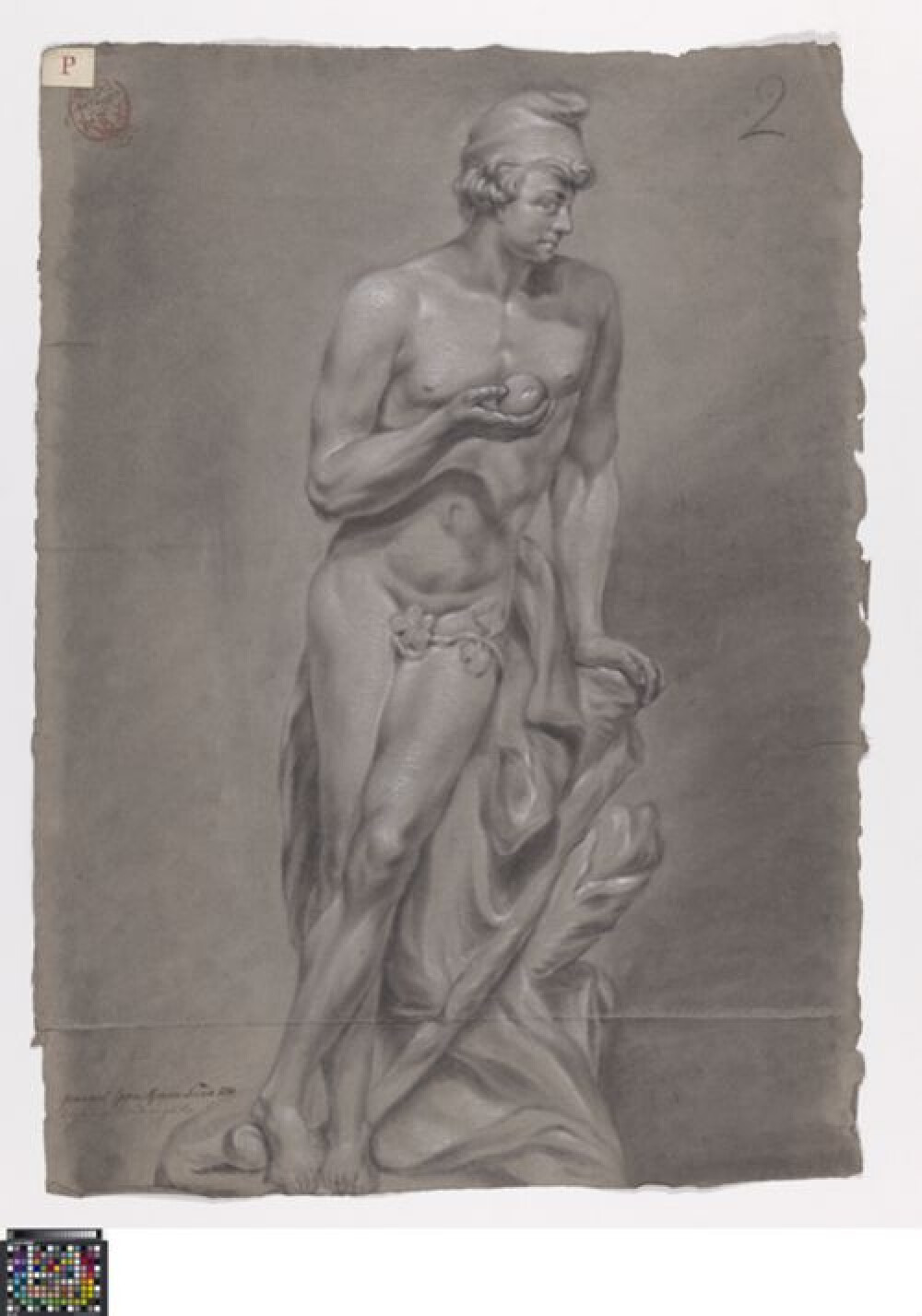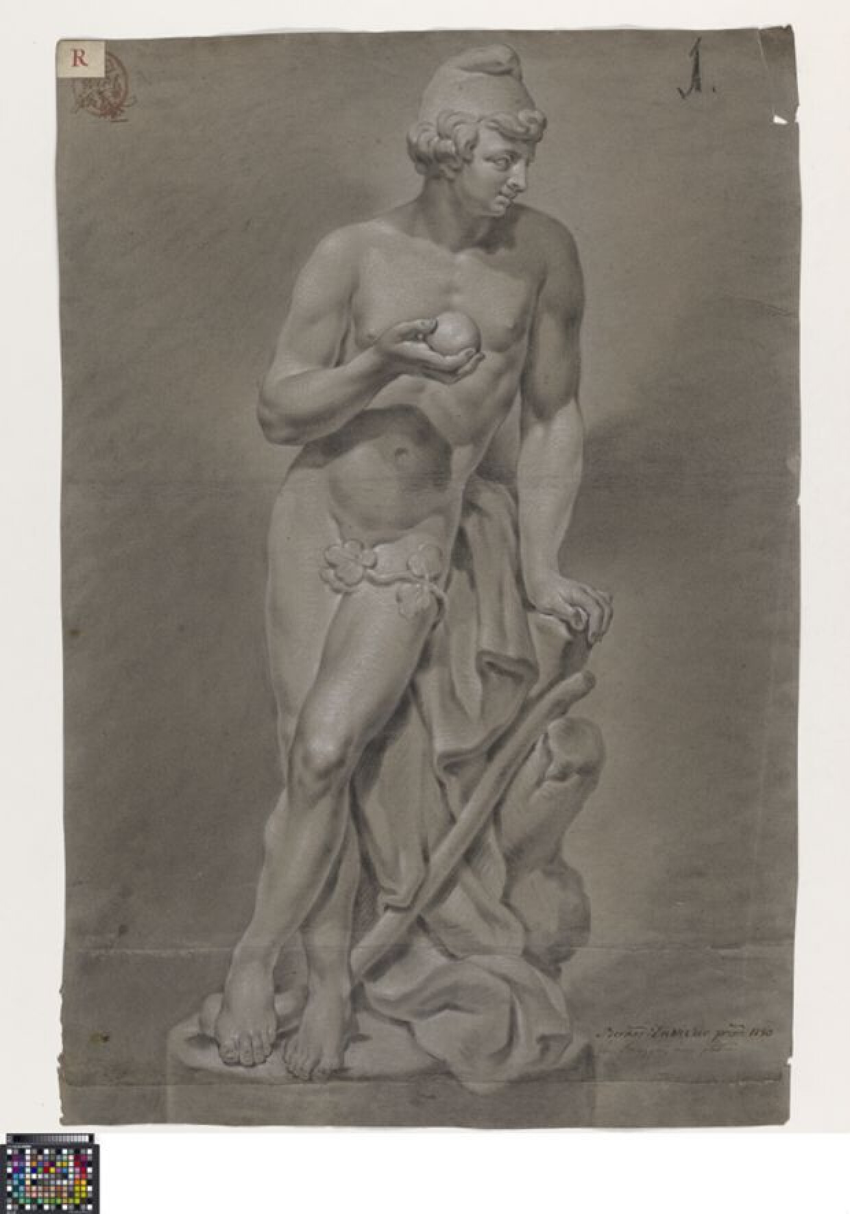18de eeuwAcademische studie naar sculptuur van Paris, getekend door Jean-Bernard Duvivier in 1780. Hij tekende deze studie tijdens de prijskamp van 1780 aan de Academie van Brugge. Duvivier, afkomstig van Brugge, was toen ingeschreven als leerling in de klas naar sculptuur of 'plaster', vermeld in het opschrift onderaan de tekening. Hij won de wedstrijd en werd primus van zijn klas. Het onderwerp van deze wedstrijdtekening is de sculptuur van Paris, afgebeeld met frygische muts en appel in de rechterhand. De naakte jonge herder leunt tegen een boomstronk, waarover een gedrapeerd doek ligt. Het gaat om een afgietsel van een marmeren 'statuette' van N.F. Gillet. De sculptuur is vanuit frontaal oogpunt getekend. In het archiefdocument SAB, Academie nr. 19 wordt het beeldhouwwerk omschreven als 'den Paris fransche figure'. Het gebruikte medium is zwart krijt of houtskool, met hoogsels in wit krijt. Er zijn twee papierstroken aan het tekenpapier aangelijmd onderaan. Op het nieuwe formaat werden de voeten van Paris en het onderste gedeelte van de sokkel vervolledigd. Hierop werd, na afloop van de wedstrijd, de naam van de leerling genoteerd, met zijn behaalde prijs en het jaartal van het concours: Bernardus Duvivier, primus 1780. Bovenaan de tekening verwijzen opschriften naar de wedstrijddeelname. Linksboven is de tekenletter van Duvivier 'R' op het papier aangebracht. Op de academiestempel plaatsten Paul De Cock (directeur) en Jan Slock (secretaris) hun handtekening. Rechtsboven werd Duviviers prijs (1) op het tekenpapier genoteerd. Zijn klasgenoot Joannes Sprakman won de tweede prijs in de wedstrijd: 0016.GRO0066.II.