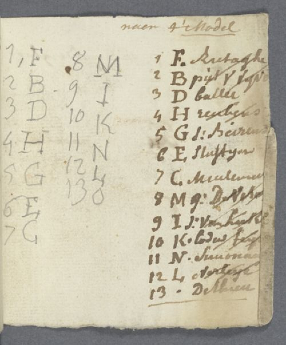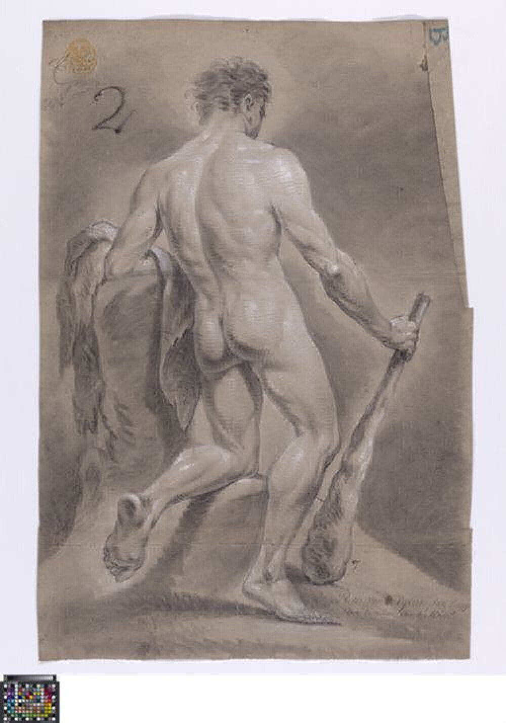18de eeuwAcademische studie van een knielend mannelijk naakt als Hercules, getekend naar levend model in 1774 door Albertus Riethage. Hij maakte deze studie tijdens de prijskamp aan de Academie Brugge in de klas naar levend model. Hij won toen de eerste prijs. Het naaktmodel wordt knielend afgebeeld met de rug naar de tekenaar gedraaid. Hij steunt met zijn linker elleboog op een hoge boomstronk waarop een leeuwenvel gedrapeerd ligt. Met zijn rechterhand steunt hij op een grote knots. Hij buigt door zijn knieën en laat de linkerknie op de boomstronk rusten. De man draait zijn gezicht naar rechts en kijkt naar onder. Met de toepasselijke rekwisieten wordt het model als Hercules uitgebeeld. In de annotatie onderaan wordt Riethage met een andere voornaam vermeld: Jacobus in plaats van Albertus. Het papier werd samengesteld door twee aangelijmde vellen. Het gebruikte medium is houtskool of zwart krijt, met hoogsels in wit krijt. Jan Garemijn ondertekende linksboven als directeur van de Academie. Op de academiestempel plaatste secretaris Charles Verhulst zijn handtekening. Rechtsboven is de tekenletter (M) van de leerling in blauwe inkt geschreven. Deze werd tijdens het concours afgedekt door de hoek te plooien. Op de achterzijde staat de toegewezen letter F die de jury te zien kreeg. Hiermee werd de studie anoniem beoordeeld door de wedstrijdjury. Hij tekende ook nog een tweede wedstrijdstudie: 0016.GRO0040.II. Klasgenoot Pieter Van de Vivere won de tweede prijs: 0016.GRO0043.II. De poseersessie werd door Garemijn gedocumenteerd in zijn notitieboekje (0000.GRO1676.7.II.17r). Het gaat om een potloodschets van het model, waarbij Garemijn naast de pose (27ste actie) ook de knots schetste. Hij schreef erbij dat het model (Jan Oost) vijf avonden poseerde voor de eerste klas of groep, van 1 tot 5 maart 1774. De tweede klas tekende vijf daaropvolgende avonden.