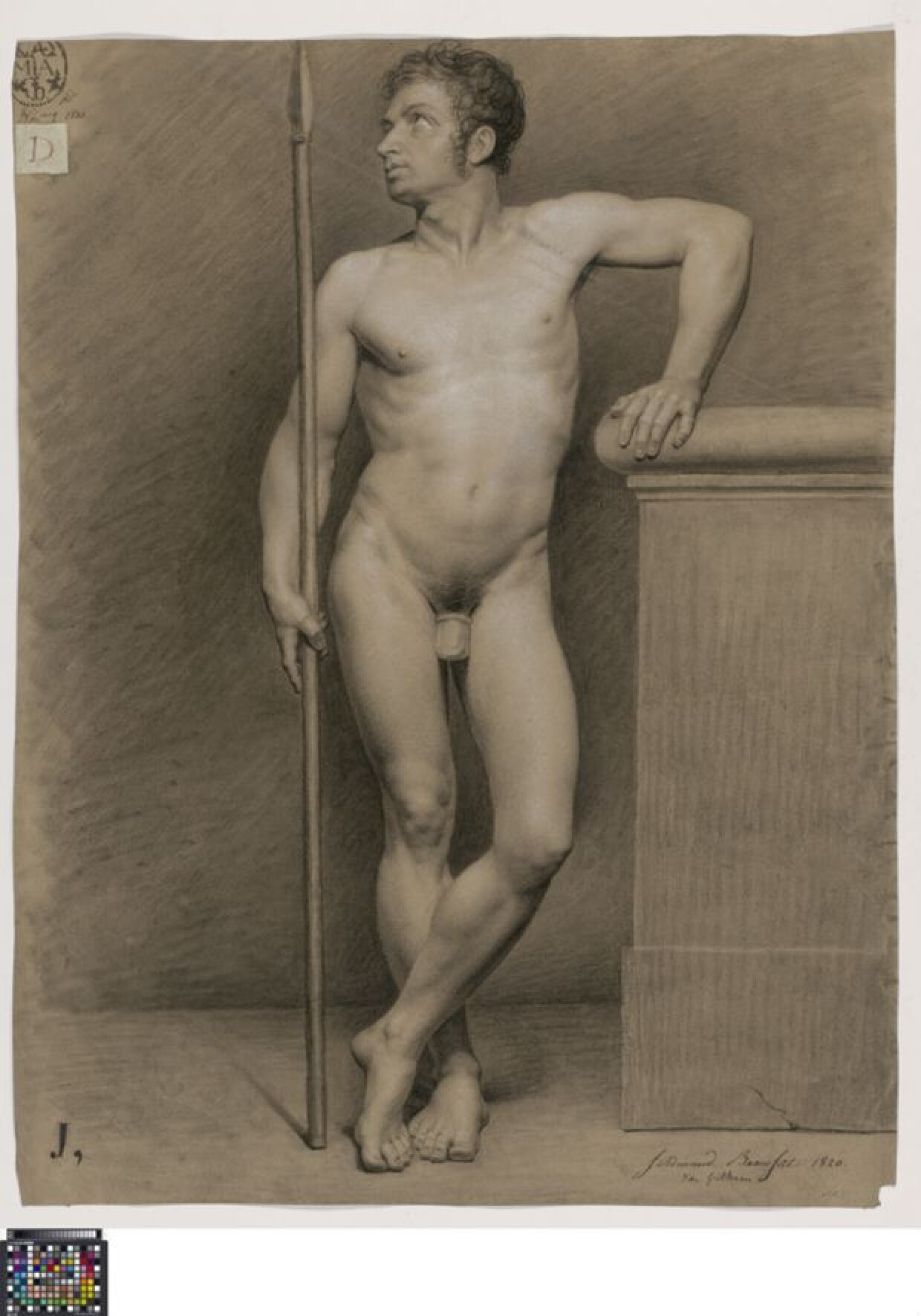 Academische studie naar levend model van een mannelijk naakt, getekend door Fernand Beaufort in 1820. Beaufort was toen leerling in de klas naar model aan de Academie Brugge. Voor de wedstrijd om prijs maakte hij twee studies (zie ook 0016.GRO0170.II) waarmee hij primus van zijn klas werd. Charles Verschaeve behaalde de tweede prijs (0016.GRO0172.II). Een naakte man is voluit en frontaal afgebeeld. Hij staat rechtop met zijn linkerbeen geplooid, de voet gekruist over zijn rechter. Met zijn linkerhand steunt hij op een hoge sokkel. Zijn gezicht is in profiel naar links weergegeven, de blik naar boven gericht. Met ontspannen rechterarm houdt hij een speer vast die op de grond staat. De studie is gemaakt in zwart krijt of houtskool, met hoogsels in wit krijt. De bladranden zijn rondom afgesneden. De aantekeningen duiden op Beauforts wedstrijddeelname. Op het etiket staat zijn toegewezen tekenletter 'D'. Daarboven zijn de academiestempel en handtekening van directeur Ducq zijn te zien. Dat Beaufort eerste werd in de prijswedstrijd, werd linksonder met een 'J,' (of 1,) genoteerd. Nadien werden ook zijn naam, afkomst en het wedstrijdjaar opgeschreven.