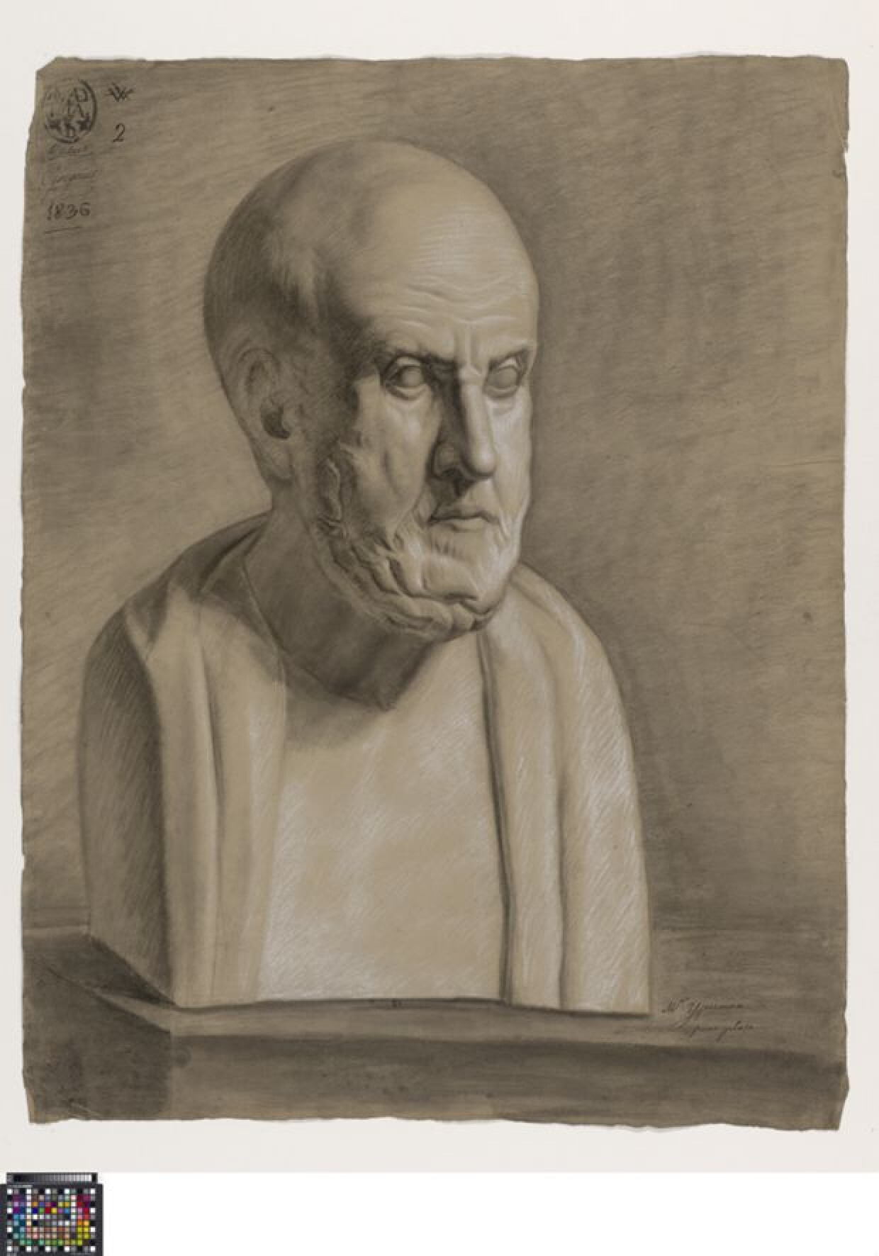 19de eeuwAcademische studie naar sculptuur van Hippocrates, getekend door Pierre Yperman in 1836. Yperman maakte deze studie als leerling in de klas naar plaaster of sculptuur aan de Academie Brugge. Hij werd ermee tweede bij de wedstrijd "om plaatsen" - zie de aantekening rechtsonder. Dominique Cavé won de wedstrijd (0022.GRO0574.II). Yperman tekende deze studie naar een afgietsel van een buste van Hippocrates. Hippocrates, weergegeven met een toga over zijn schouders, is in driekwart naar rechts getekend. Het gebruikte medium is zwart krijt of houtskool, met toevoeging van hoogsels in wit krijt. De tekenletter 'W', waaronder Yperman anoniem tekende, staat linksboven naast de academiestempel. Hier is ook de handtekening van directeur Gregorius zichtbaar, onder de handtekening van secretaris De Net. Op verso worden bepaalde aantekeningen herhaald, net als de academiestempel.
