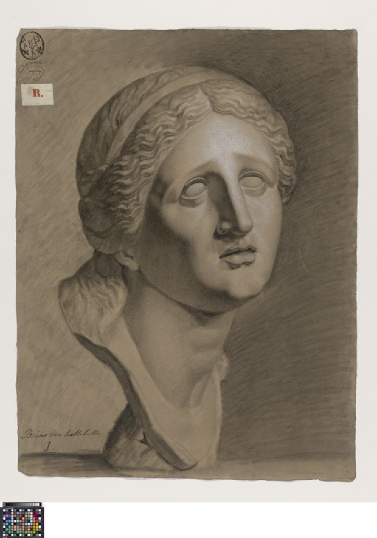 19de eeuwAcademische studie naar sculptuur van Niobe, getekend door Bruno Van Hollebeke in 1835. Van Hollebeke maakte deze studie als leerling in de klas naar 'het plaester' of sculptuur aan de Academie Brugge. Hij behaalde toen de eerste prijs van zijn klas tijdens de prijswedstrijd. Zijn klasgenoot Antonius De Witte werd tweede (0022.GRO0573.II). De leerlingen tekenden de buste van Niobe. Het gaat om een afgietsel van een detail uit het standbeeld van Niobe met haar jongste dochter. Het gebruikte medium is zwart krijt of houtskool, gehoogd met wit krijt. De aantekeningen refereren naar de wedstrijddeelname. Linksboven is een etiket verlijmd met daarop de tekenletter van Bruno Van Hollebeke voor anonieme jurering. Daarboven staat de handtekening van leraar of directeur Dumery en de handtekening van secretaris De Net. Helemaal bovenaan staat de academiestempel. De behaalde prijs werd linksonder genoteerd. Van Hollebeke maakte nog een tweede studie naar sculptuur: 0022.GRO0334.II.