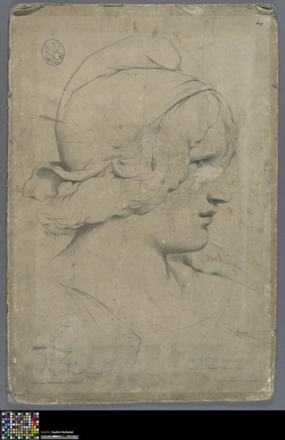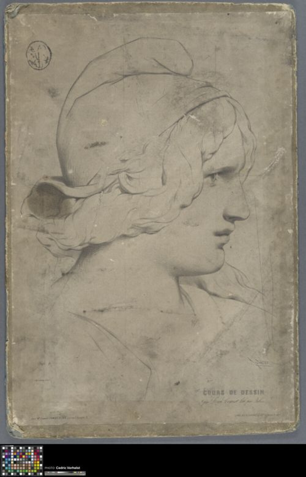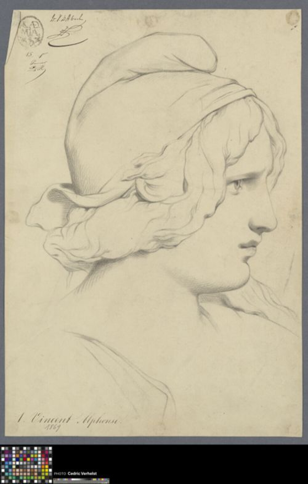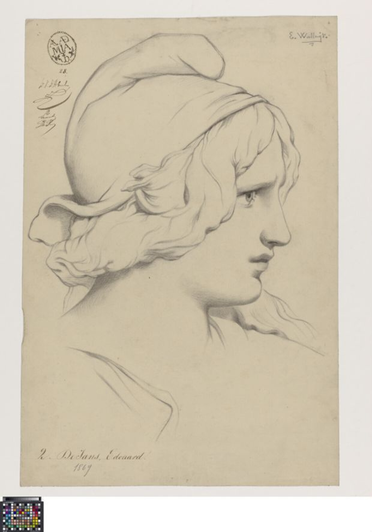19de eeuwAcademische studie naar prent van een vrouw met Frygische muts, getekend in 1869 door Edouard De Jans tijdens zijn studie aan de Academie Brugge. De Jans was toen leerling in de tweede of derde klas naar prent. Een jonge vrouw is afgebeeld tot aan de schouders, in profiel naar rechts. Ze heeft lang haar en draagt een Frygische muts. De vrouw zou Marianne kunnen voorstellen, de nationale personificatie van Frankrijk. Ze vertegenwoordigt de republikeinse waarden: vrijheid, gelijkheid en broederlijkheid. Het gebruikte medium is zwart krijt of houtskool. De Jans tekende deze studie naar een lithografie van Julien, naar een ontwerp van Cogniet (tekenaar). Twee exemplaren van deze prent, afkomstig van de Academie Brugge, worden ook bewaard in het prentenkabinet (0022.GRO0800.III en 0022.GRO0801.III). In de KBR (Algemene Leeszaal: II 34.037 D) is ook een overeenkomstige prent te vinden, ingebonden met andere prenten uit de reeks 'Nouveau cours de dessin'. Op de studie staan verschillende aantekeningen typerend voor wedstrijdtekeningen van de Academie Brugge. Bovenaan zijn de academiestempel en twee handtekeningen te zien. Rechts staat de handtekening van directeur Edouard Wallays, links de signatuur van secretaris François Vanden Abeele. Het nummer '26.' is het tekennummer van De Jans, waarmee de wedstrijdjury zijn studie anoniem kon beoordelen. Of het om een wedstrijd om prijs of om plaatsen ging, is niet geweten. De opschriften linksboven en -onder duiden wel aan dat De Jans tweede werd. Alphonse Vincent werd eerste in dezelfde wedstrijd (0022.GRO0454.II).