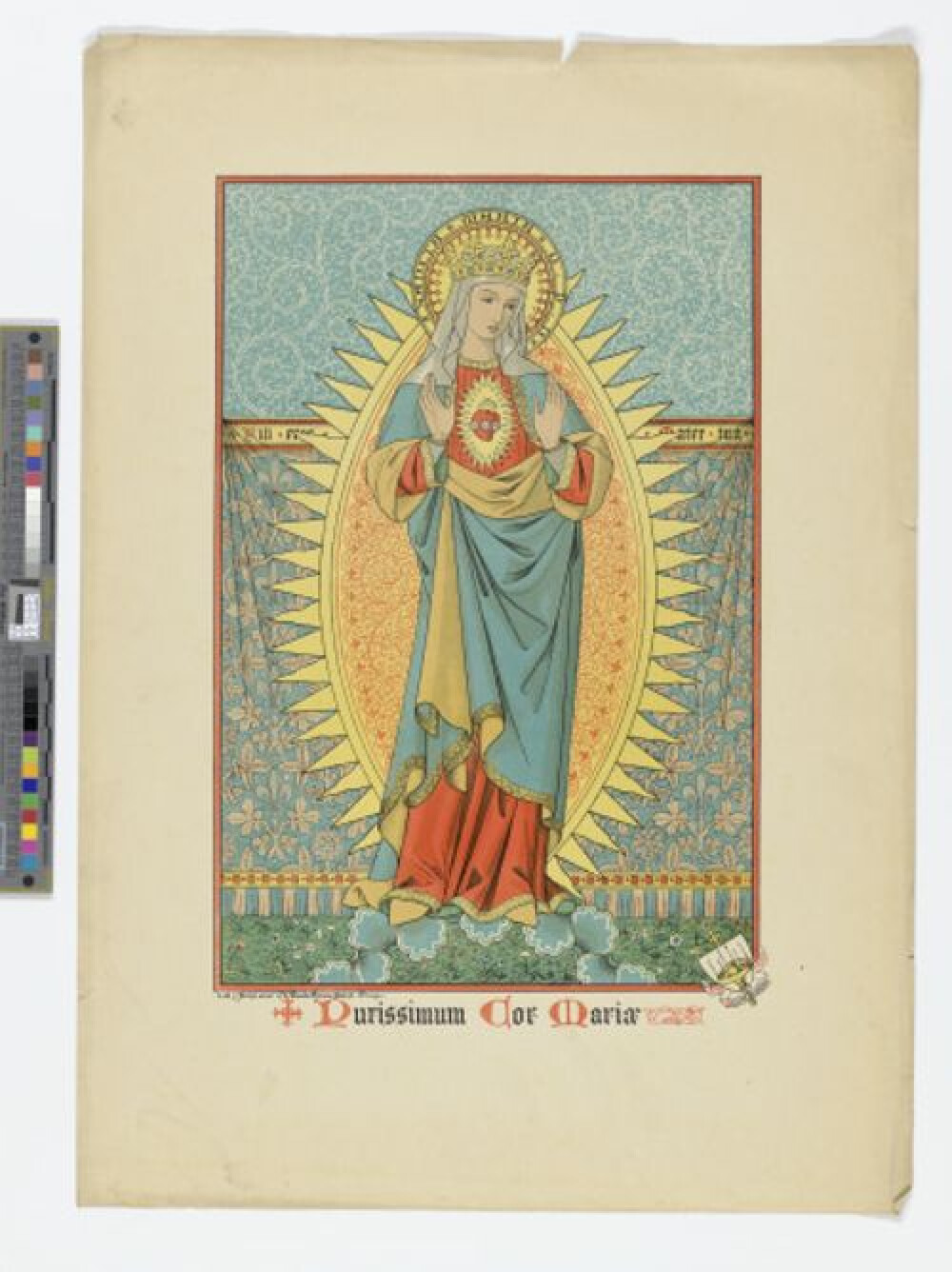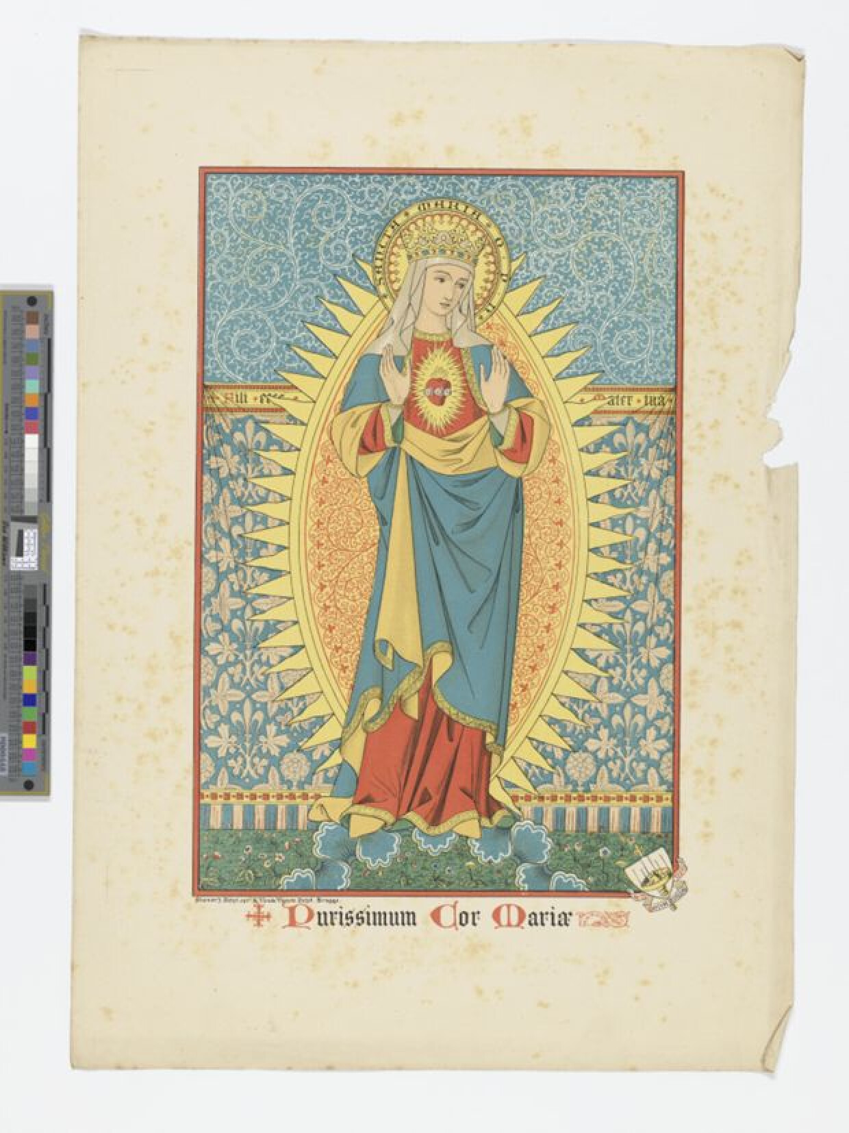 19de eeuwDevotieprent in neogotische stijl van Maria. De prent werd uitgegeven door uitgeverij Van de Vyvere-Petyt en de ‘Heilige Beeldekensgilde’. Met de oprichting in 1864 van de Heilige Beeldekensgilde (door o.m. kan. Adolf Duclos, Guido Gezelle en Joseph Neurath) drong de neogotiek definitief door in het Brugse drukwerk. De koploper in deze evolutie was de lithograaf Jakob Petyt (1822-1871). Sinds 1844 had hij zijn atelier in Brugge opgestart waar hij vanaf 1864 neogotisch drukwerk leverde. Na zijn dood, in 1871, nam zijn weduwe het bedrijf over. Vanaf 1875 kwam het bedrijf in handen van haar schoonzoon Karel Van de Vyvere-Petyt (1852 - 1922) tot 1914. Neogotische (bid)prentjes, diploma's en ander religieus drukwerk in kleurenlithografie vormden het handelsmerk van deze drukkerij.