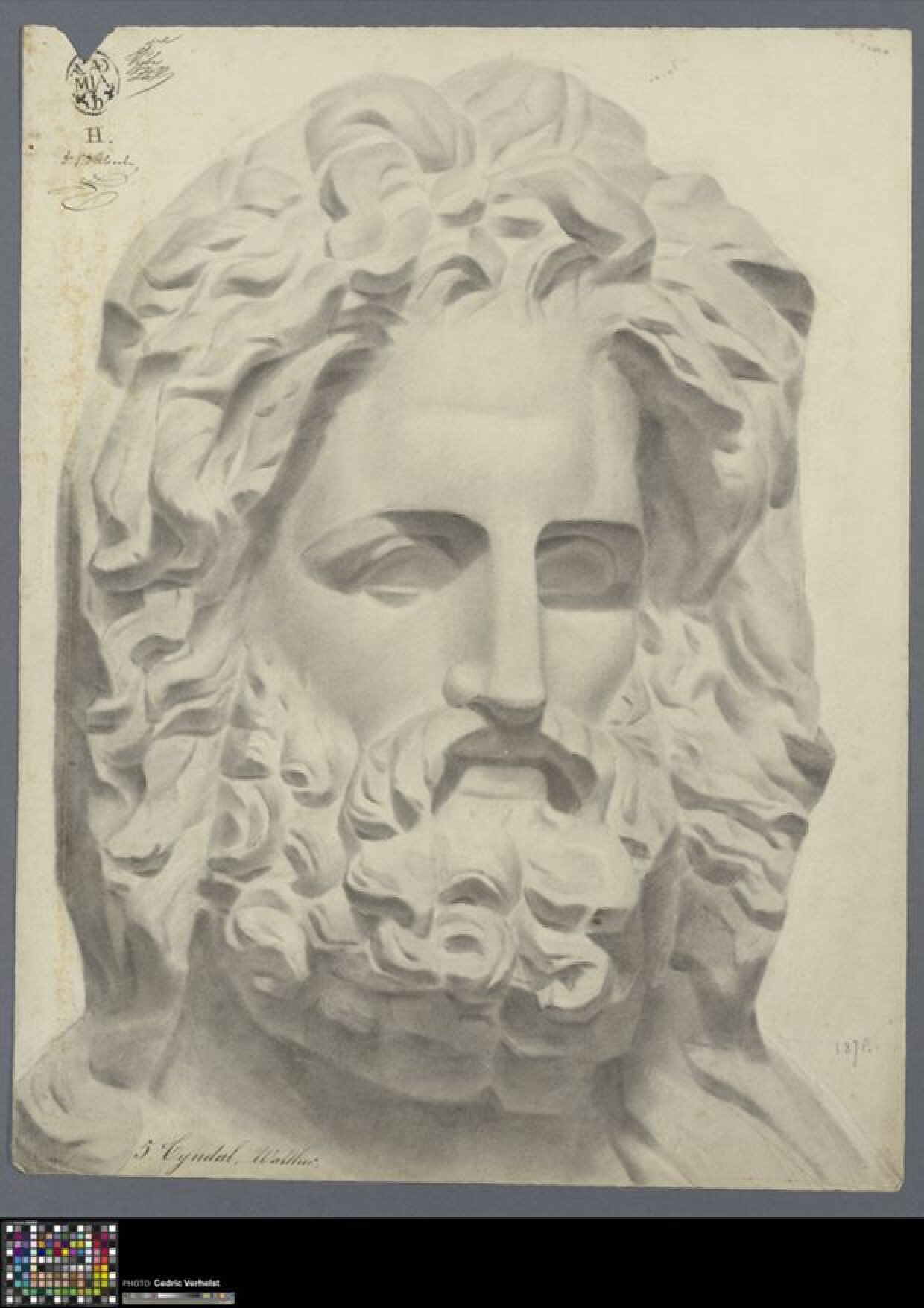 19de eeuwAcademische studie naar sculptuur van een buste van Zeus, getekend door Walter Tyndale in 1871. Tyndale was toen leerling aan de Academie Brugge en nam deel aan een wedstrijd. Met deze studie werd hij vijfde in de categorie van het tekenen naar sculptuur. Het is onduidelijk of de tekening werd ingediend voor een wedstrijd om plaats of om prijs. Wellicht gaat het wel om de wedstrijd waarbij Edouard De Jans eerste werd (0016.GRO0237.II). Het onderwerp is een buste van Zeus, ook 'Zeus van Otricoli' genoemd, naar de vindplaats van de sculptuur. De leerlingen tekenden wellicht naar een afgietsel. Zeus heeft lang krullend haar en een volle baard. Over zijn linkerschouder ligt een doek. De buste is quasi bladvullend getekend, in driekwart naar rechts. Het gebruikte medium is zwart krijt of houtskool. De aantekeningen verwijzen naar de wedstrijd. Linksboven staat de academiestempel afgedrukt op het papier, met daaronder de tekenletter 'H.' die aan Tyndale werd toegewezen voor deze wedstrijd. De handtekening van secretaris Vanden Abeele is hieronder geplaatst. Dat Tyndale vijfde werd, noteerde men naast de stempel en onderaan bij zijn naam. De datering rechts werd wellicht later toegevoegd.