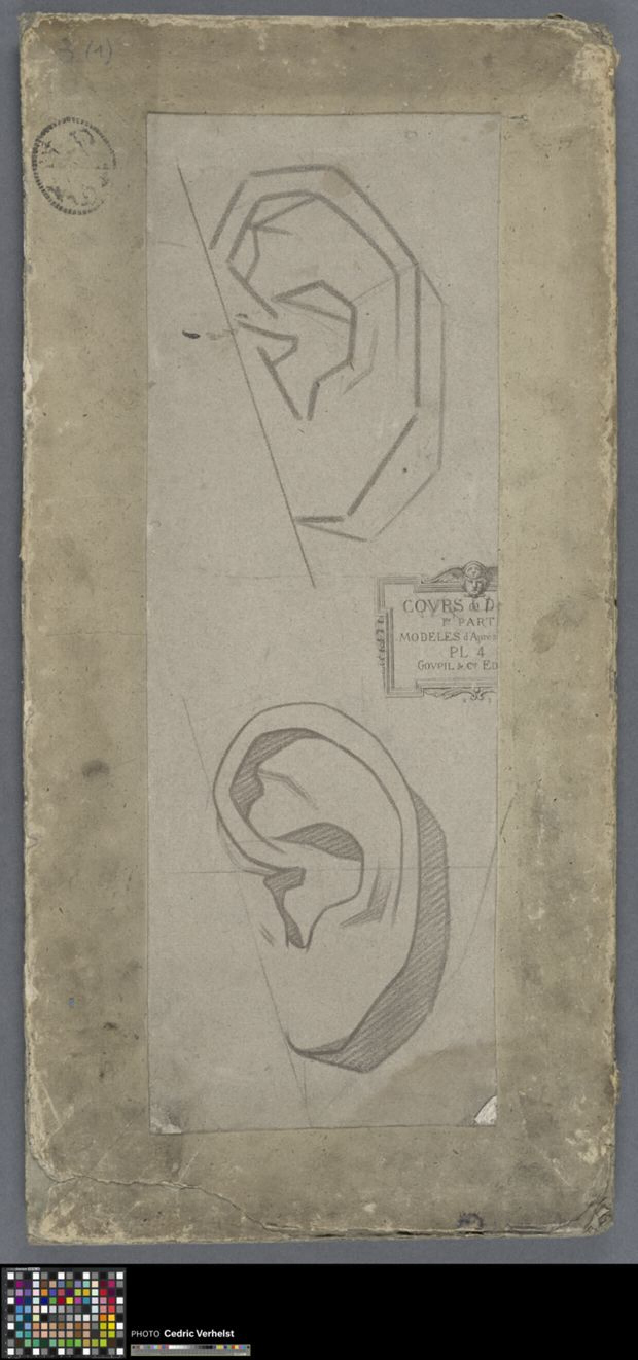 19de eeuwAcademische prent met een studie van oren, verlijmd op een steunkarton. De krijtlithografie komt uit de Cours de Dessin van Charles Bargue, uitgegeven bij Goupil en Compagnie in 1867. Het gaat om een fragment van Plaat 4 uit het eerste deel "Modèles d'après la Bosse". Er zijn twee oren afgebeeld op de prent: bovenaan een lijntekening met de hoekige basisvorm van het oor; daaronder hetzelfde oor in rondere lijnvoering met schaduwpartijen en toegevoegde hulplijnen in zwart krijt of houtskool. Tussen de afbeeldingen is het titelschild gedrukt binnen een geornamenteerd kader. In de Academie Brugge circuleerden de krijtlitho's van Bargue als lesmateriaal voor de beginnersklassen. Er werden meerdere exemplaren van dezelfde prent gebruikt (cf. 0022.GRO0822-24.III en 0022.GRO0828-29.III). Deze prenten zijn allemaal afgesneden en gemonteerd op karton.