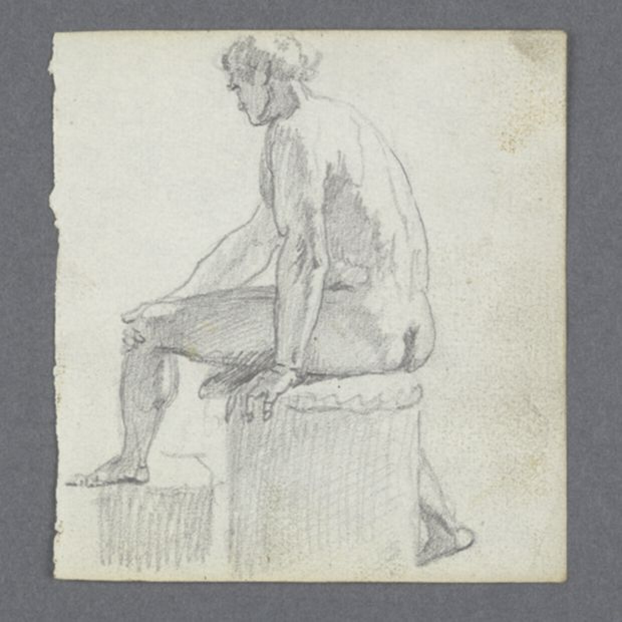 18de eeuwStudie naar levend model in grijs potlood op klein papierformaat, getekend door Jan Garemijn. Het los blad was oorspronkelijk ingebonden, samen met de andere 23 schetsblaadjes uit deze reeks. De schetsen werden eerder bewaard bij het notitieboekje 0000.GRO1676.7.II, van Garemijn als directeur van de Brugse Academie, uit 1773-1774. Op het kleine vel tekenpapier is een zittende naakte man geschetst, in driekwart naar links. De man zit op een ronde sokkel, zijn linkervoet steunt daarbij op een voetblok. Met zijn rechterarm houdt hij zijn linkerknie vast. Zijn linkerhand steunt naast zijn lichaam. Garemijn schetste deze pose verschillende keren: zie bv. 0023.GRO0400.13, 15 en 18.II. Het gaat vermoedelijk om hetzelfde model. Verso: blanco.