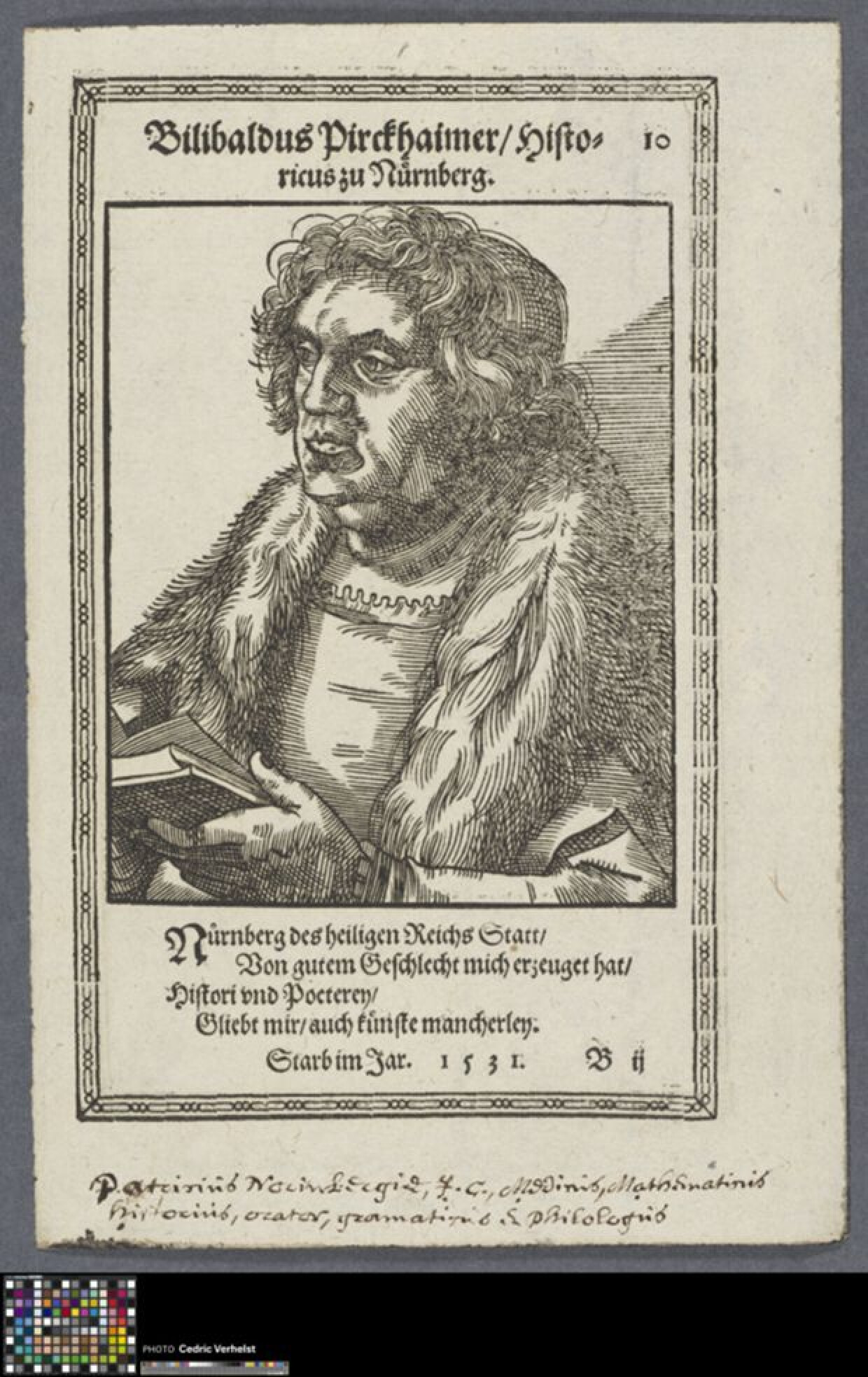 16de eeuwWillibald Pirckheimer (1470-1530) was een Duits jurist, schrijver en humanist uit de Renaissance. Daarenboven was hij een prominent figuur in Neurenberg in de 16de eeuw. Als een van de belangrijkste culturele mecenassen van Duitsland was hij de beste vriend van de kunstenaar Albrecht Dürer, die een aantal portretten van hem maakte. Ook was het een goede vriend van de humanist en theoloog Erasmus. Willibald is halvelings naar links afgebeeld in een rechthoekig kader. Hij heeft weelderig haar en draagt bont over zijn schouders. Hij houdt met beide handen een opengeslagen boek vast en kijkt voor zich uit. Zowel boven als onder de voorstelling is in de marge een opschrift te lezen dat meer informatie biedt over de geportretteerde. De prent maakt deel uit van een verzameling portretten, bestaande uit 103 houtsneden, gepubliceerd in "Contrafacturbuch. Ware und Lebendige Bildnussen […]" (Straatsburg, 1587). De prent maakt deel uit van het album met (losse) portretten uit de 16de en 17de eeuw (2014.GRO0019.III).