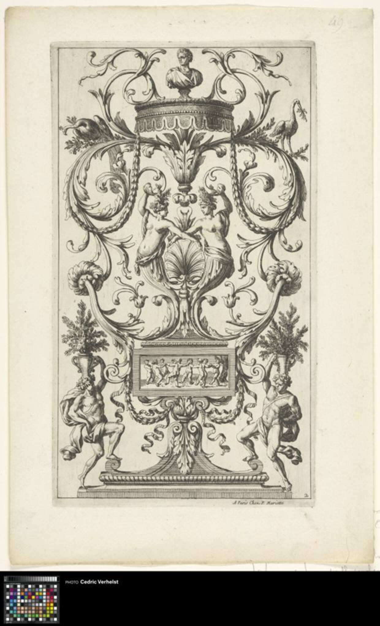 17de eeuwTweede plaat van een publicatie over moderne ornamenten. De prent toont klassieke arabeske en groteske motieven. Twee naakte vrouwelijke bovenlichamen staan centraal rond een rocaille. Bovenaan staat een borstbeeld en onderaan houden twee mannelijke figuren vazen op hun hoofd. In een rechthoekige voorstelling staan enkele putti in een cirkel.